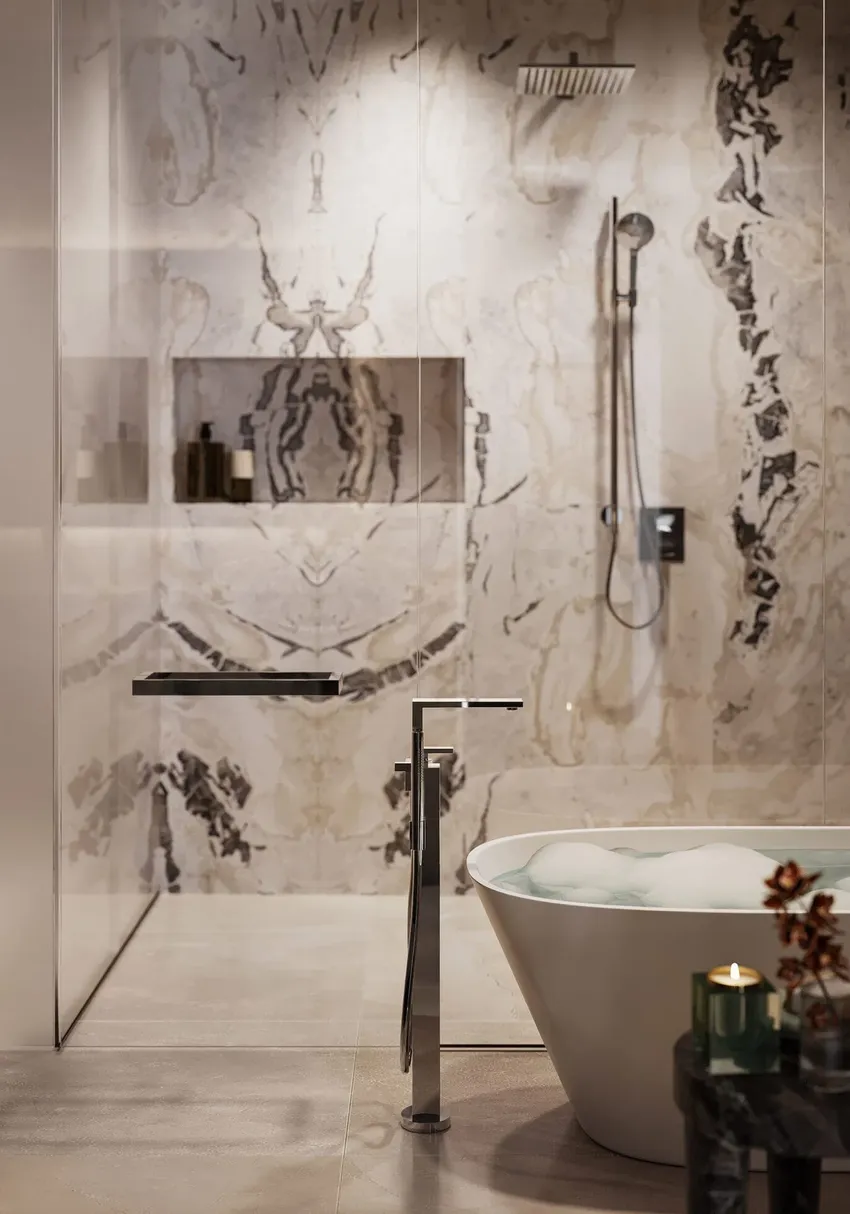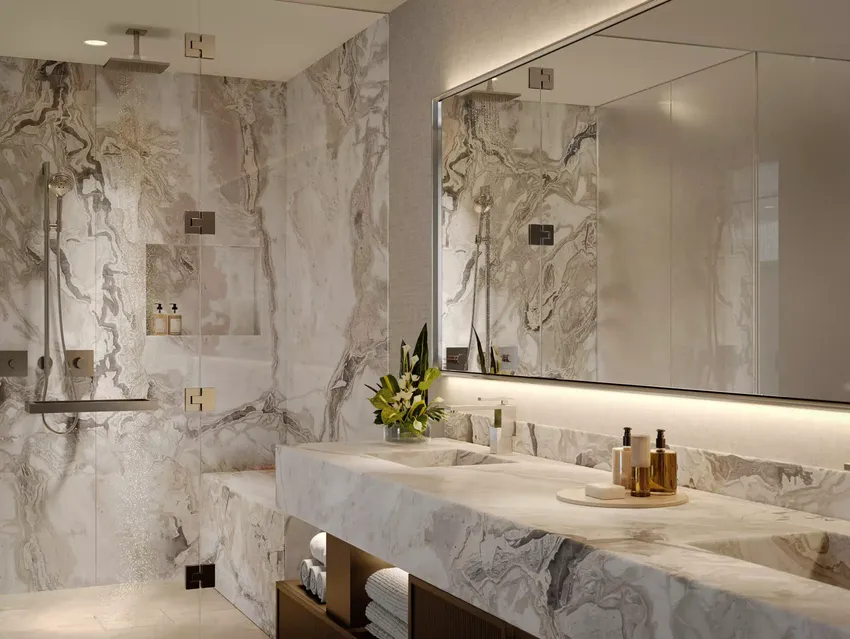 Los baños se terminan con piedra natural y mármol e incluyen bañeras exentas, lavabos dobles y duchas tipo rain shower.