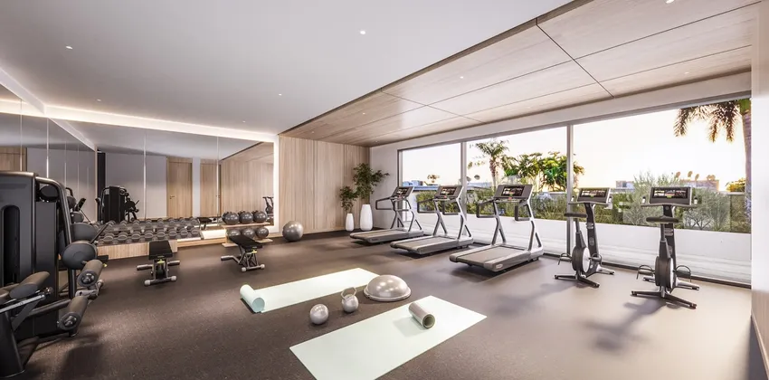 - Gimnasio moderno equipado con equipos de última generación para entrenamiento cardiovascular y de fuerza