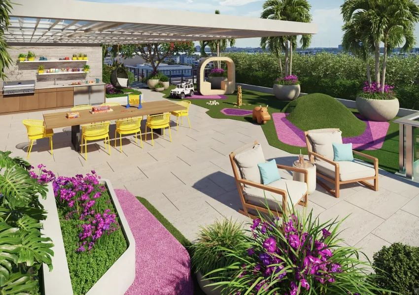 La Baia North Bay Harbor ofrece 20,000 pies cuadrados de amenidades estilo resort, que incluyen más de 8,500 pies cuadrados de paisajismo tropical exuberante con césped abierto en todo el terreno. Además, hay una terraza de entretenimiento en la azotea de 10,000 pies cuadrados con un área dedicada para niños y una zona para adultos.