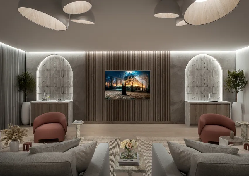 - Sala de club con vista al agua con asientos tipo lounge, un teatro y un bar privado de entretenimiento