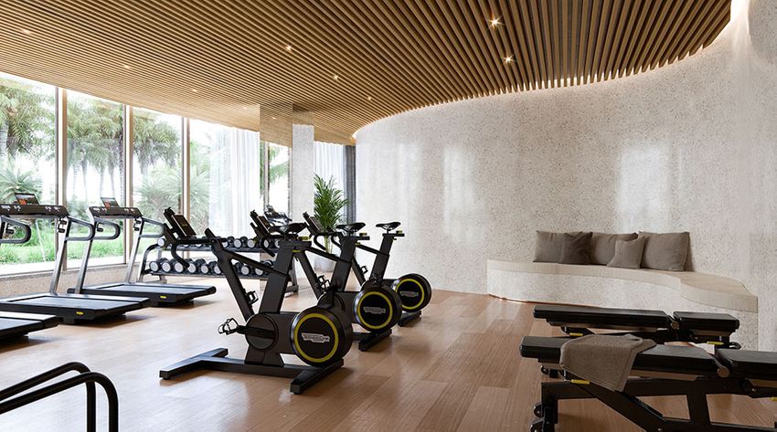A huge wellness center on the ground floor combines a magnificent gym and spa. Wooden ceilings with star-shaped lamps, abundant landscaping of the halls, and huge panoramic windows create a unique atmosphere of untouched nature and, at the same time, exceptional comfort. The gym is equipped with a range of advanced fitness equipment for strength, cardio, and aerobic training. For lighter workouts, fit balls, rubber cushions, rugs, and many other accessories are provided with which you can do fitness or Pilates. On the border between the gym and the spa is an indoor yoga studio with carefully crafted relaxing lighting, beautiful green panoramas, and silence that will leave you entirely focused on yourself. The spa center combines a sauna with a steam bath and medical rooms prepared for a wide range of spa and wellness treatments. End your visit to the spa in the panoramic room with candles and sun loungers by the huge windows overlooking the tropical greenery.