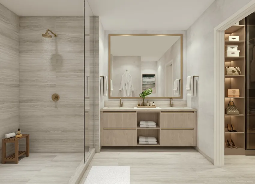 - Gabinetes premium de Italkraft, encimeras de piedra importada con lavabos dobles y espejos decorativos.