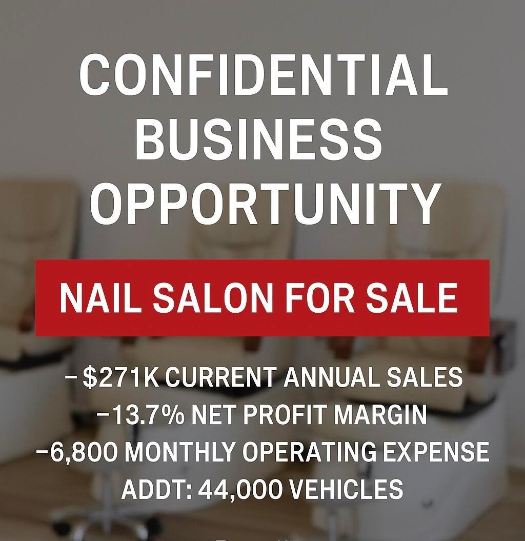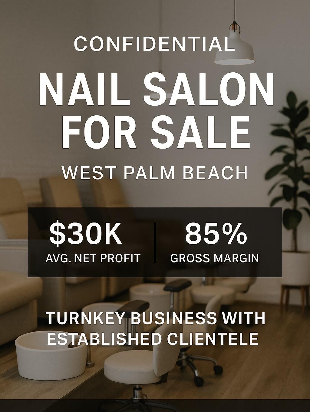 Confidential sale of a clean, modern nail salon business in the West Palm Beach area generating more than 270K annually with steady repeat clients and strong social-media-driven demand. The business features updated equipment, an efficient layout, and a streamlined operational setup that supports consistent daily activity. Located along a high-traffic commercial corridor with strong visibility, this turnkey opportunity eliminates the time and expense of building out a new space. The option to apply for the assumable long-term lease provides stability and continuity for a buyer seeking an established, ready-to-operate business. Full details released with NDA. Asset and DBA sale only - tangible & inventory assets, goodwill, marketing materials, photography rights, and more.