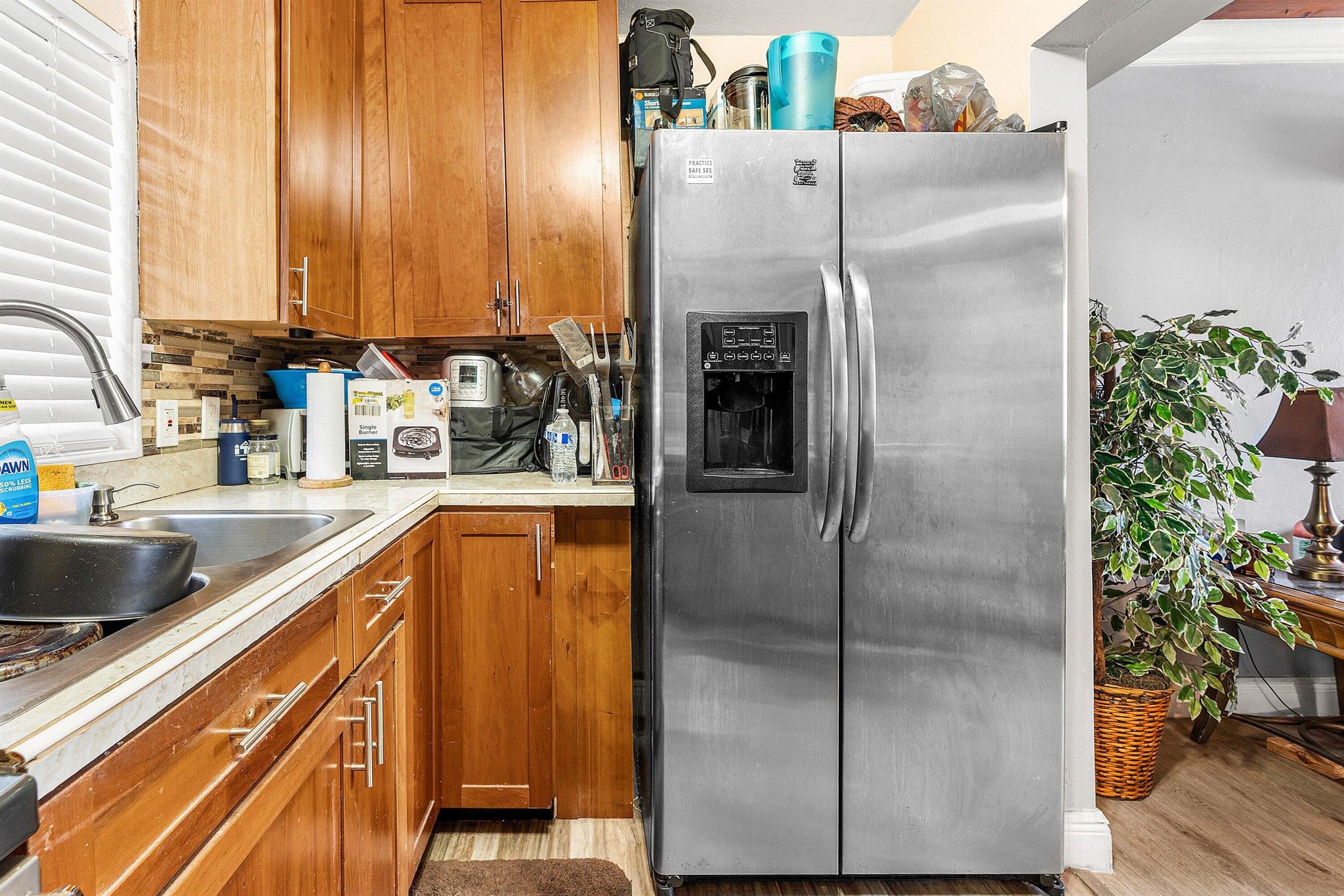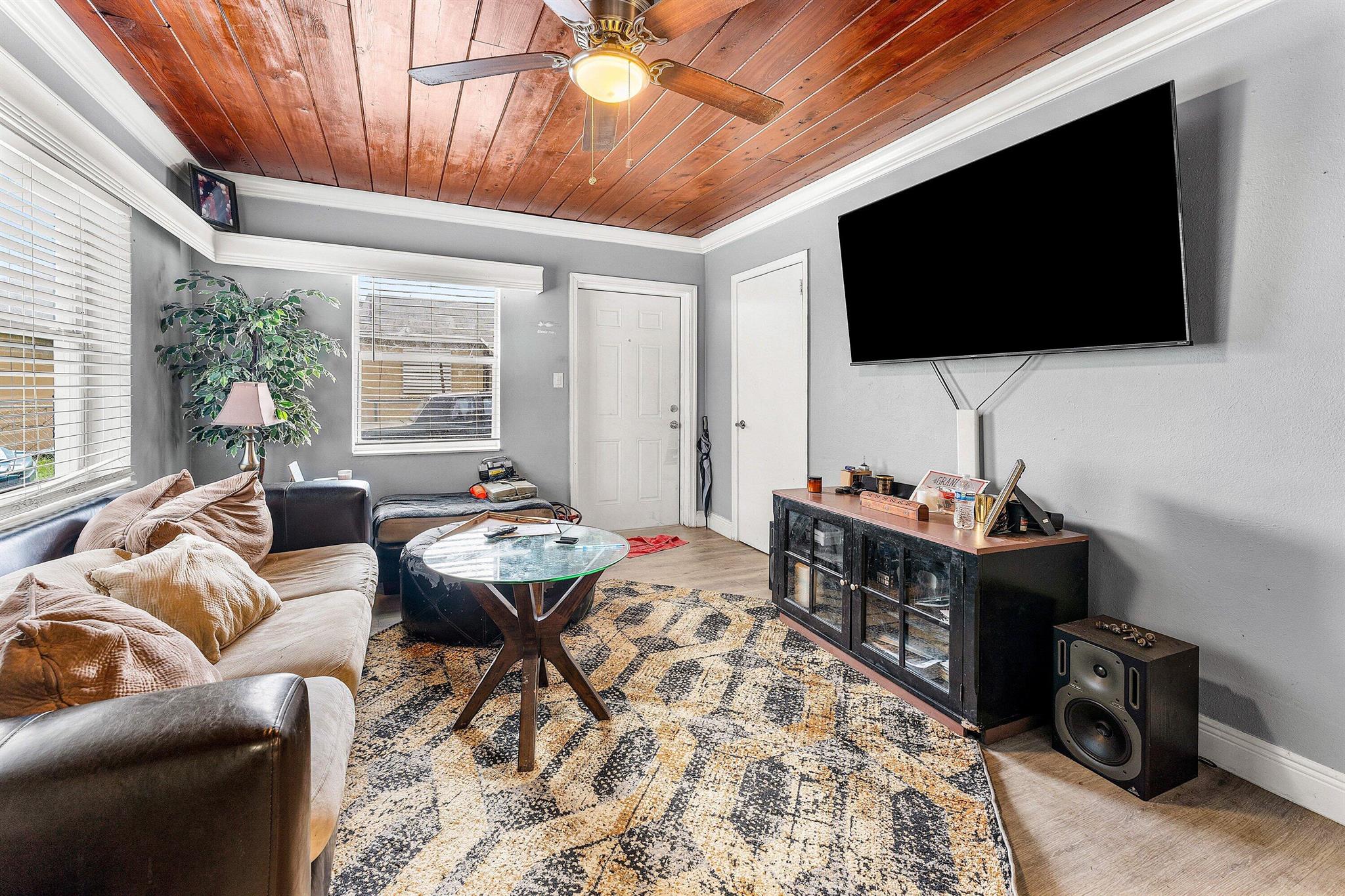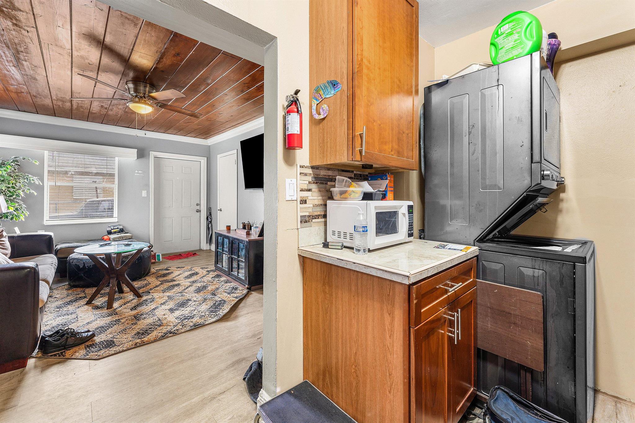 Excellent investment opportunity located just minutes from the Intracoastal and downtown, offering strong rental potential and long-term value. This beautifully updated duplex features two fully remodeled units, each with its own driveway, laundry, and separate utility meters, making it an ideal setup for investors or owner-occupants seeking reliable income with minimal maintenance.Unit 1 is a spacious two-bedroom, one-bath residence that has been tastefully updated throughout. The interior features wood-look vinyl flooring, a decorative tongue-and-groove wood ceiling, updated fixtures, and an abundance of natural light. The kitchen comes equipped with solid wood shaker cabinetry, ceramic tile countertops, a brick backsplash, and stainless steel appliances. The master bedroom