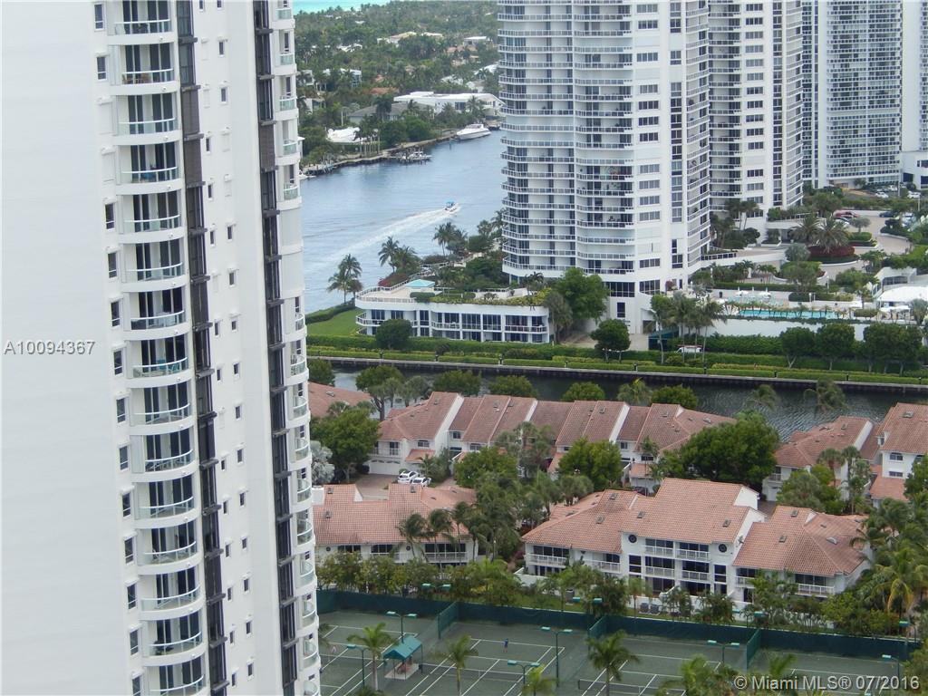 Panoramic ocean and city views from this high floor 3 bed, 2 bath corner unit. Two balconies. Walk-in closets. Hurricane shutters. Two parking spaces. Walking distance to Marina of the Waterways. Resort style spa, sauna, tennis courts, pool, BBQ areas, library and party room. Easy to show.