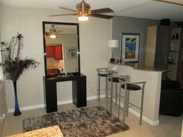 AMAZING OPPORTUNITY Magnificent 1 bedroom 1 bath fully tiled and updated everything. Remodeled kitchen w/ new cabinets and granite counters. Includes a covered parking space right in front of the entry. This Garden unit is on a green belt and has lovely v iews including pool area. Screened patio. Very private condo is next to multi million dollar Golden Isles homes and benefits from the 24 hour guard gate into the community. Safe, secure and ready to go. Priced to sell quickly. All ages. Low Taxes & Maint.
