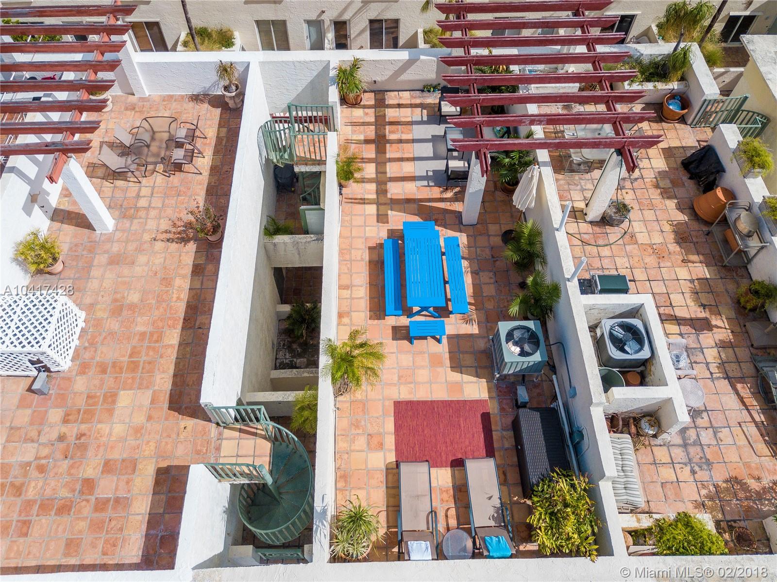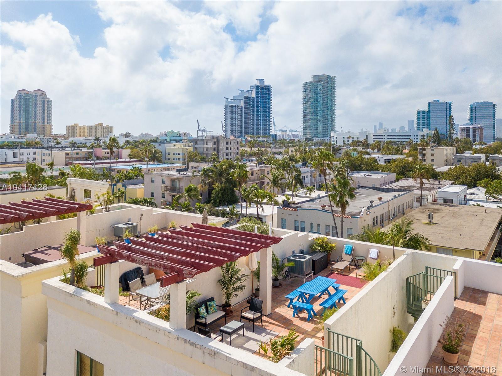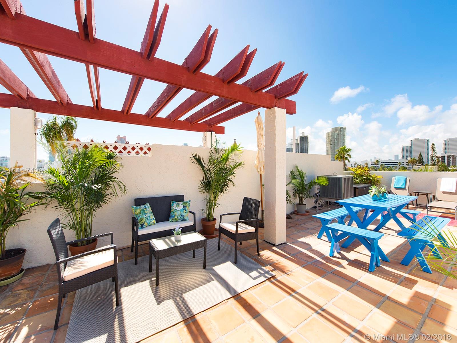Spacious two story contemporary home with fabulous huge rooftop tiled patio and amazing 360º views of South Beach just a few blocks from the beach. Living/dining/kitchen/half-bath on main level with two airy balconies. Master-bedroom suite with en-suite bath on upper level includes front loading washer/dryer, large walk-in shower, two large walk-in closets, three exposures and lots of windows and light. Private roof-top patio offers unobstructed views, planted palms, gazebo, electricity and water & total privacy. Two covered parking spaces in secure garage under communal garden. Villa living in the center of fabulous South Beach! Large dogs ok.