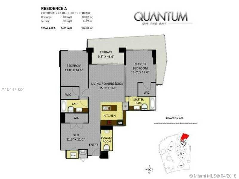 SE corner and the best line in the building. Amazing unobstructed water views. 2 bedrooms and 2.5 bathrooms. Quantum offers a state of the art 7,000 sqft gym, 2 pools, resident club house, movie theater, valet, and more. Very close to Downtown, Miami Beach, Wynwood, Art District, Midtown, and Airport. The park across the street offers tennis courts, basketball courts, and volleyball.