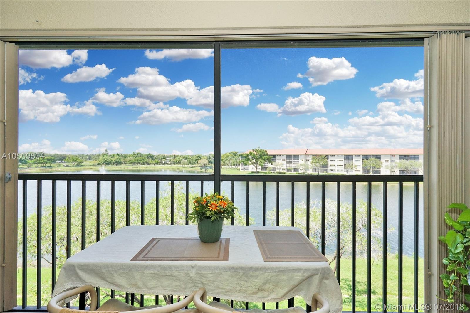 Wow! Don't miss the chance. To live in this 2 bedrooms 1.5 bathroom 4th floor condo. With a western exposure from the patio that has an unobstructed view of the lake and water fountain. The building is located in a Cul De Sac. This unit is extremely well kept and maintained in pristine condition. Laminate wood floors throughout the condo. Stack-able washer and dryer. Added cabinetry in the kitchen. Built in ladder with access to the attic in the master bedroom closet. New ownership must wait 2 years before renting. This condo is in the most exclusive 55 plus community in Pembroke Pines. Resort style living with a million dollar clubhouse, movies,fitness center,transportation,free golf,pharmacy,cafe,24 hour security patrol and more.