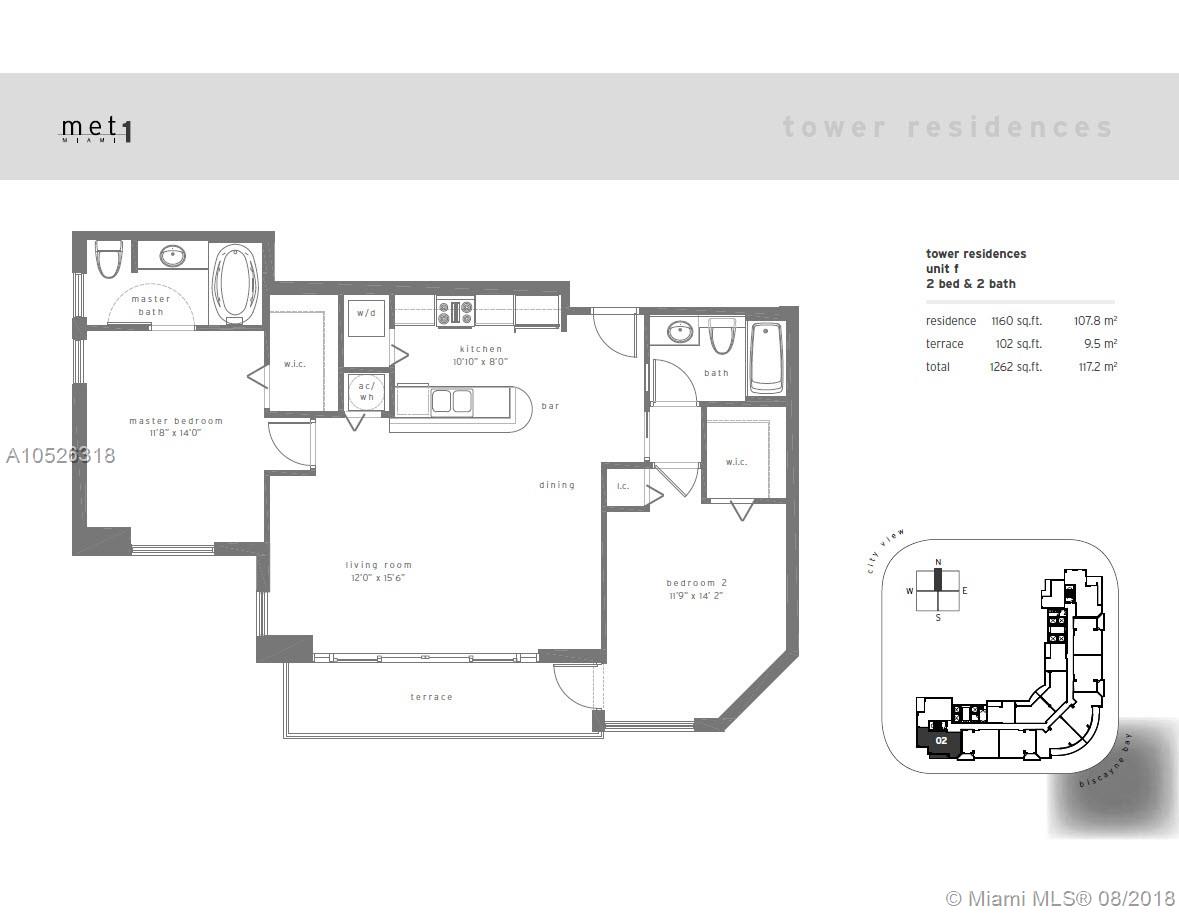 2-Bed/2-Bath condo with direct-water views at Met 1 located in the epicenter of Downtown Miami. 1,160 SF of interior living space offering 24" porcelain flooring, hurricane-impact windows with window treatments, open-concept kitchen with granite countertops and stainless-steel appliances, in-unit washer/dryer and an expansive terrace with stunning bay views. Amenities include pool, jacuzzi, billiards/club room, waterfront gym and kid's room. Ideal location--walking distance from Whole Foods, great restaurants, shopping and entertainment.
