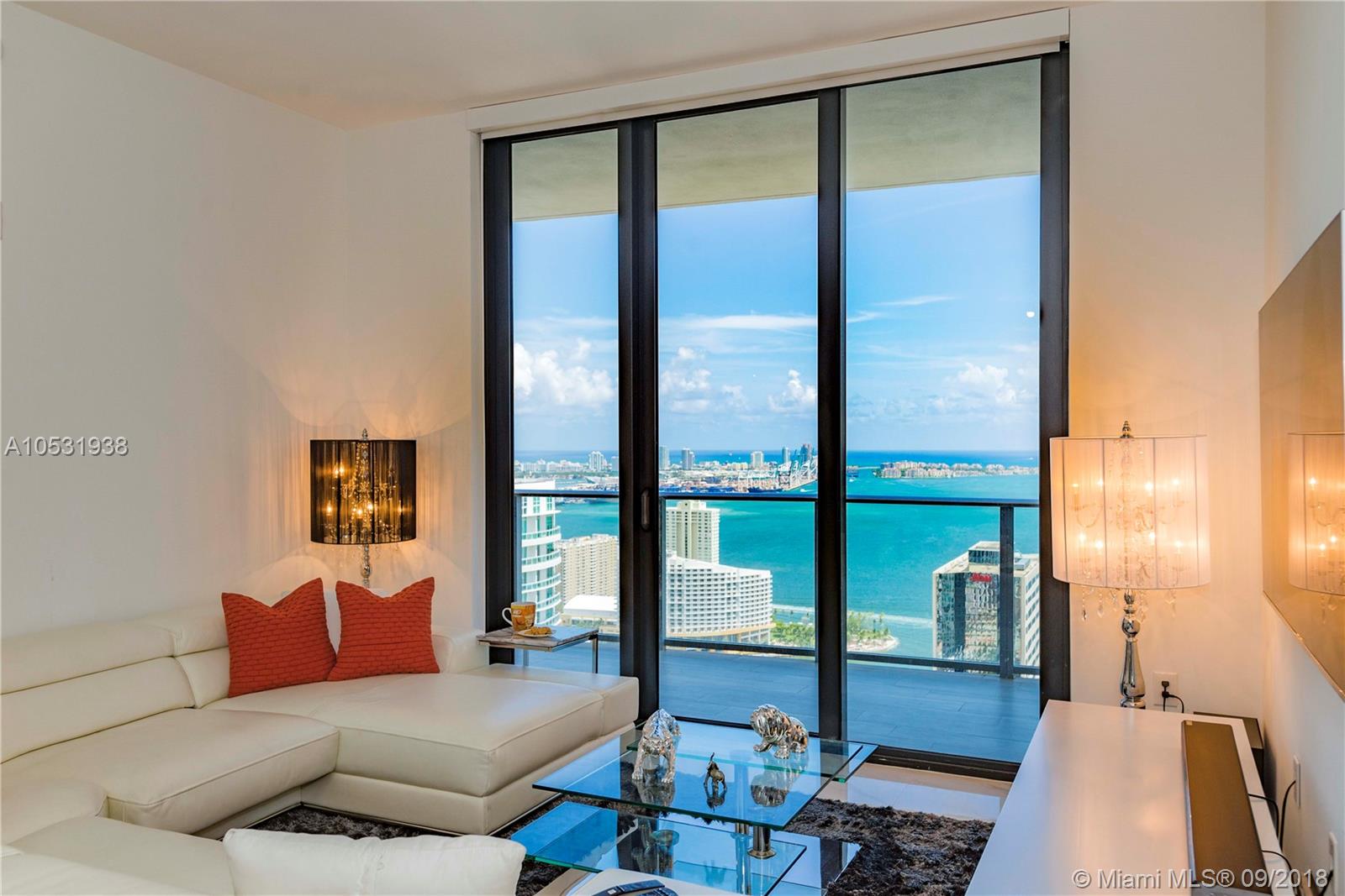 A superb and sophisticated architectural masterpiece by Sieger Suarez. Perched high above the 47th floor, the private elevator launches you into this 2 bed + den, 3 bath residence covering a total area of 1,778 sq ft (as per Developer’s). Features include floor to ceiling wall of glass with breathtaking views of Biscayne Bay & Miami skyline, two spacious balconies, 36’ x 36’ Carrara style Italian porcelain floors plus a gorgeous European kitchen with SS appliances. 1010 Brickell provides a multitude of amenities: indoor heated pool with a retractable glass walls that provides access to the outdoor pool & Jacuzzi, lavish sun deck & rooftop terrace, exclusive access to the 2-story ‘The Club at 1010,’ a spa with a Hammam Turkish steam bath area, fitness center & running track plus much more.