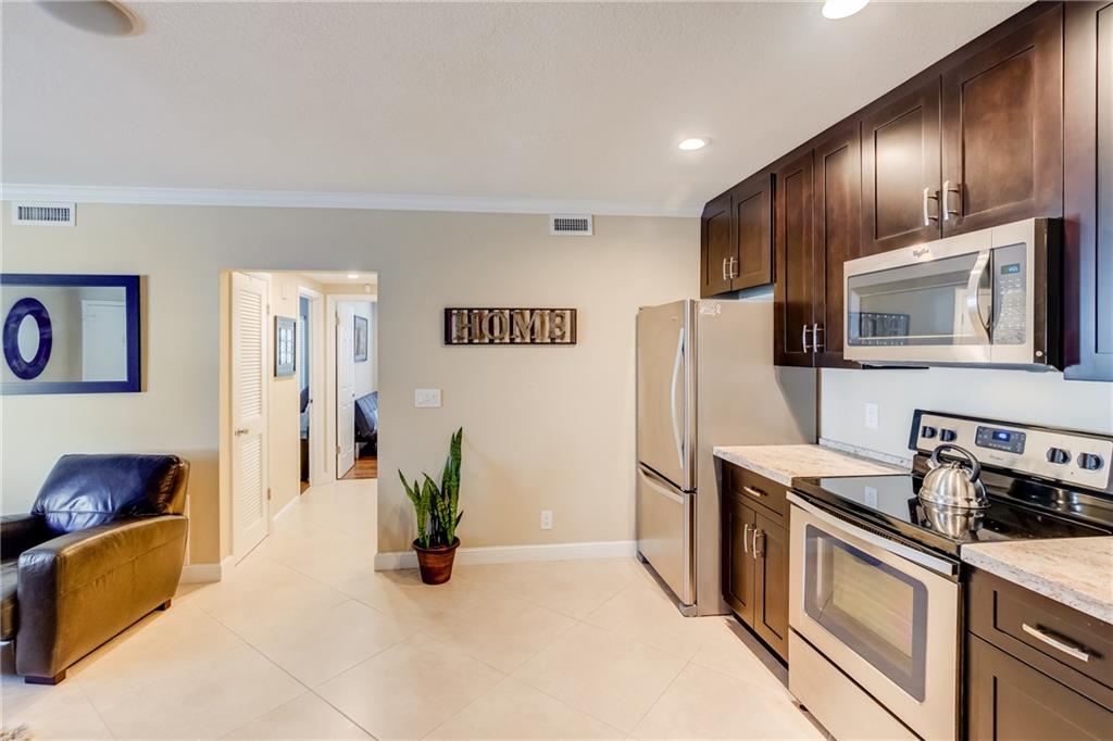 Completely remodeled , rarely available first floor corner unit. All new flooring, granite counters, wooden cabinets, premium lighting, built-in sound system and two flat screen TVs included. Awesome East Fort Lauderdale location. Minutes from the Beach, walking distance to: Park, Library, Restaurants, Stores, Supermarket. Complex has large heated pool and cabanas, community room, fitness center and Gas Grills. Private storage locker, Cable & Water Included with condo fee. All new appliances including air handler and water heater. Service/Emotional Support Pet allowed with proper documentation. One assigned parking space. All ages welcome.