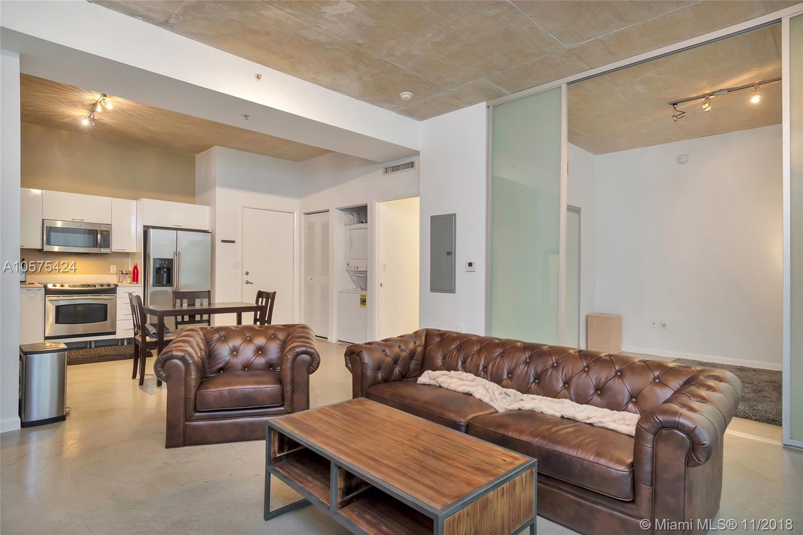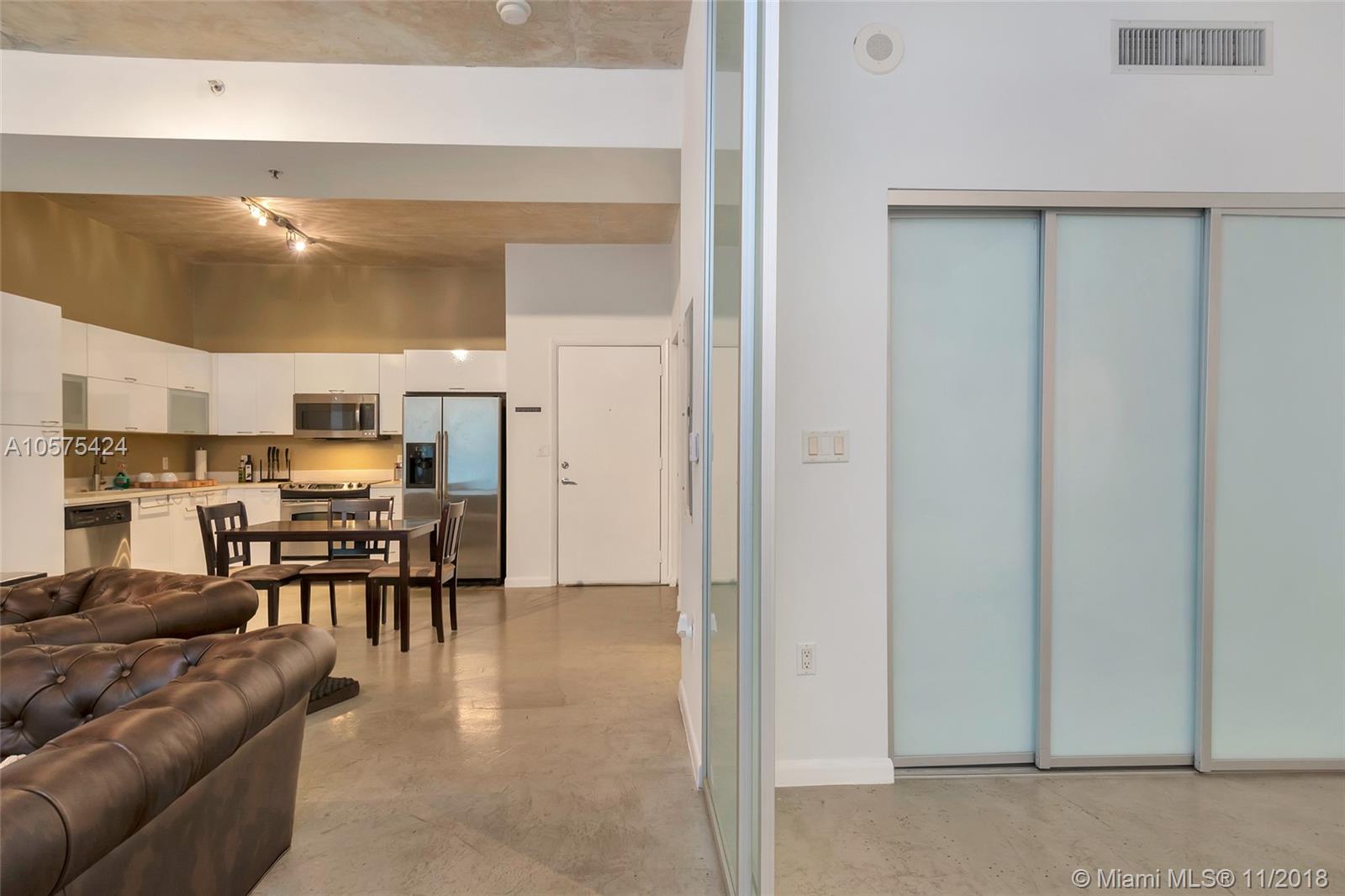 Live in the heart of Miami, loft style in a wonderful location. Beautiful and spacious loft unit, open layout, Italian styled kitchen with stainless steel appliances, polished concrete floors and high ceilings for a very urban feel. The unit has a set of sliding framed tainted glass doors that provide privacy when needed with a great look and style. Washer and dryer inside the unit. Prime location close to metro mover, shopping, many restaurants, concert venues, and entertainment. Garage parking space included. Pet friendly.