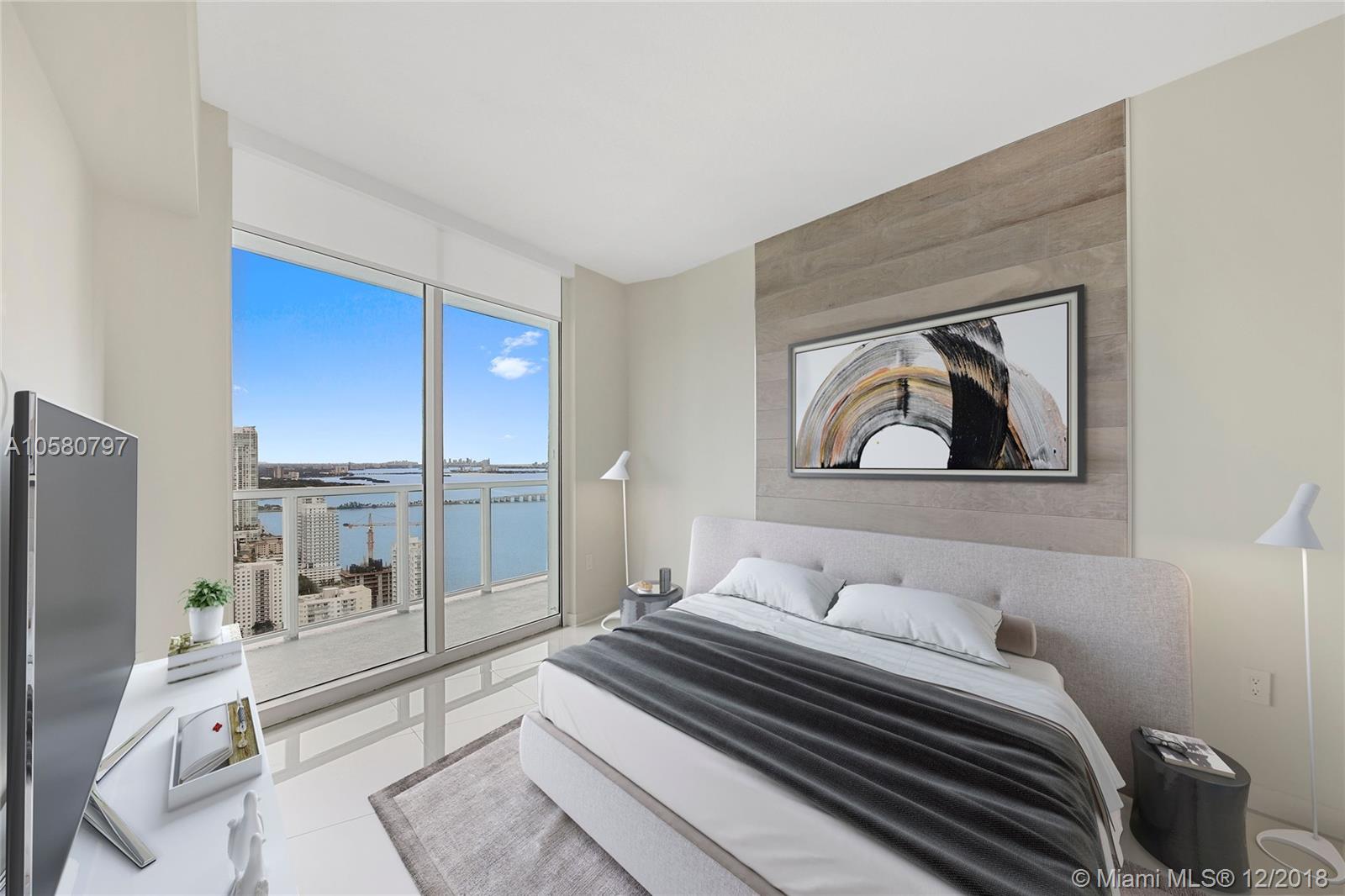 Rarely available, fully remodeled large 1bdrm + large den that can easily be converted into another bdrm or office. This unit is on the 42nd floor with stunning unobstructed views of Biscayne Bay and Miami Beach. The unit boasts of high end porcelain flooring and a remodeled Kitchen island extended with stone counter tops along with Cabinetry to the ceiling, providing additional storage space. The kitchen also has extebded white quarts countertops, high end sliding barn doors and motorized window treatments and a new front end washer and dryer. Luxury amenities include: 24h concierge, valet, convenience store, spa/hair salon, pool, jacuzzi, fitness center, saunas, movie theater and more. Short drive to Brickell, Wynwood, Design District shops and South Beach. Call today, easy to show.