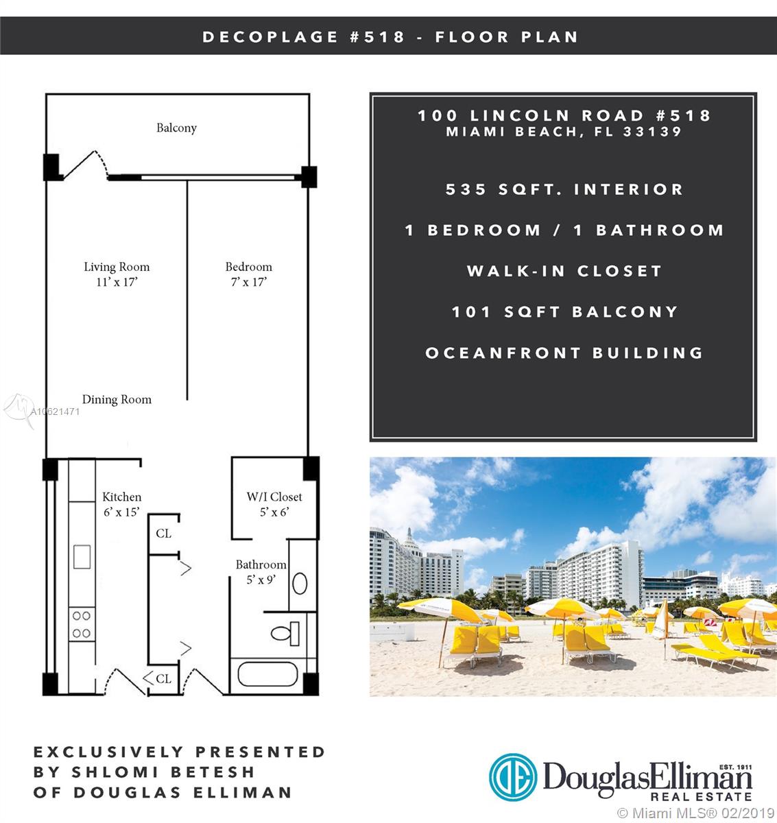 Fantastic 1 bedroom / 1 bath at the Decoplage. This unit is one of the rare ones to be offered with a parking space. Impact windows and doors throughout and a super spacious balcony. This residence is in great condition and offers abundance of afternoon sunlight. The kitchen welcomes a nice bar area and offers plenty of storage. It opens to a great living area that then leads on to the balcony. The main bathroom is perfectly constructed to serve both a guest and an end-user. Live right on the sandy beaches of Miami Beach and be within a short distance to world famous restaurants and shops.