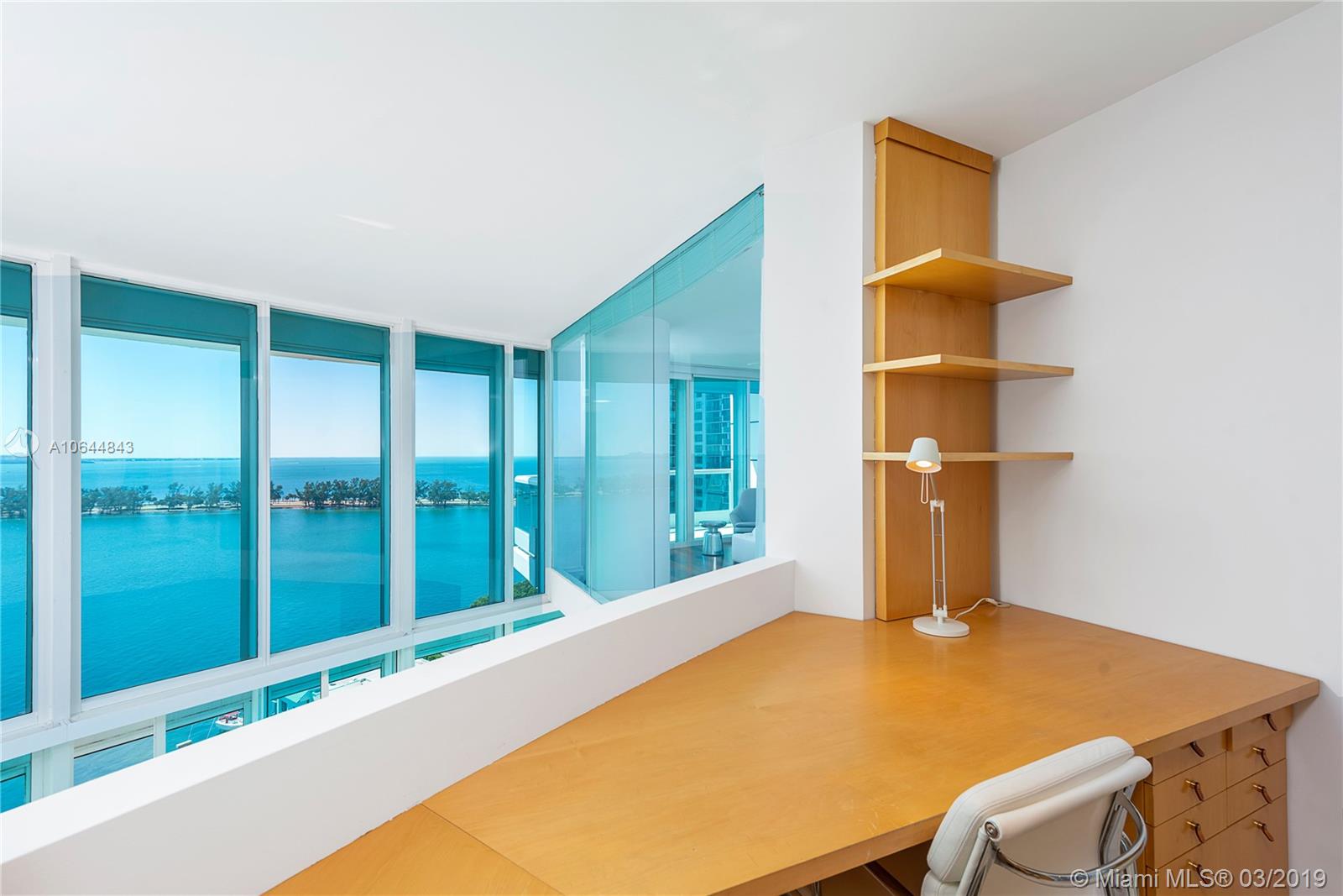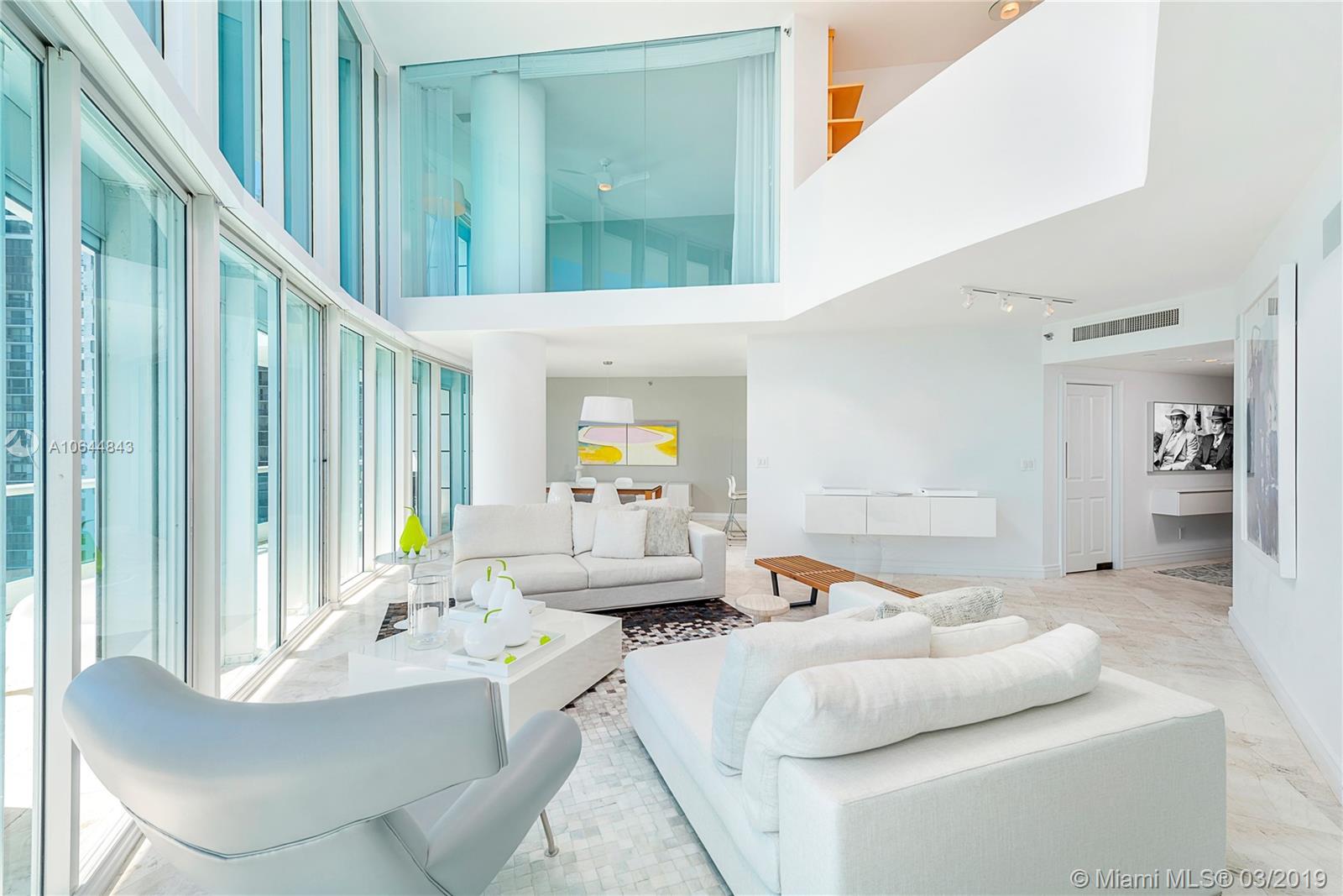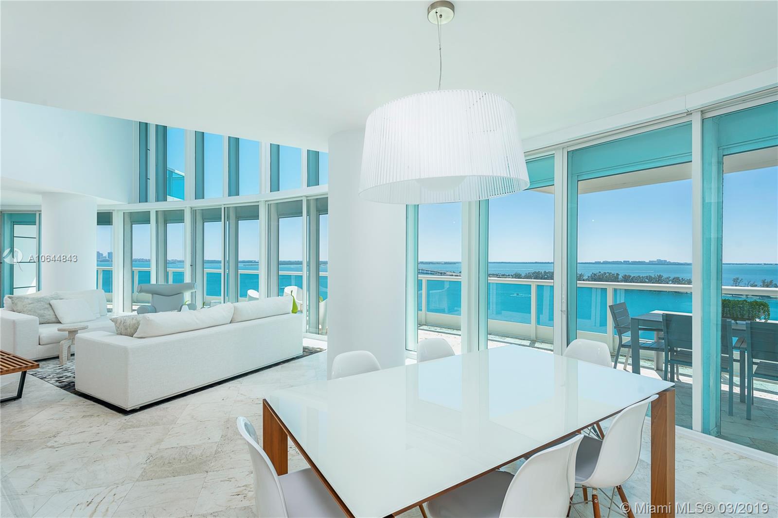 Distinguished Full Service Ugo Columbo building. Highest floor all waterfront Townhome (floors 18/19th ) double height 50 ft wide great room w/floor to ceiling windows (approx. 18' Ht), & panoramic views of Biscayne Bay /Ocean from all rooms. approx 2700 sf interior plus approx 700 sf waterfront wrapped terraces from all principle rooms. 2 Bedroom Suites & Office & Den. 3Ba & Powder room. Stone main floor w/ gracious foyer & wide stone stair to upstairs. Master w/ own terrace, two WIC, two baths & linen. Guest with Bth, own terrace, WIC and 2 linens. Ample storage throughout. 3 parking spaces, Concierge, Tennis, fitness, coffee shop. Kitchen w/ New stainless appliances. Laundry room. Millionaires mile location close to upscale shops & dining, I-95 & KB.