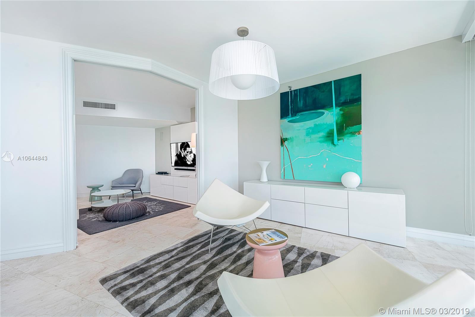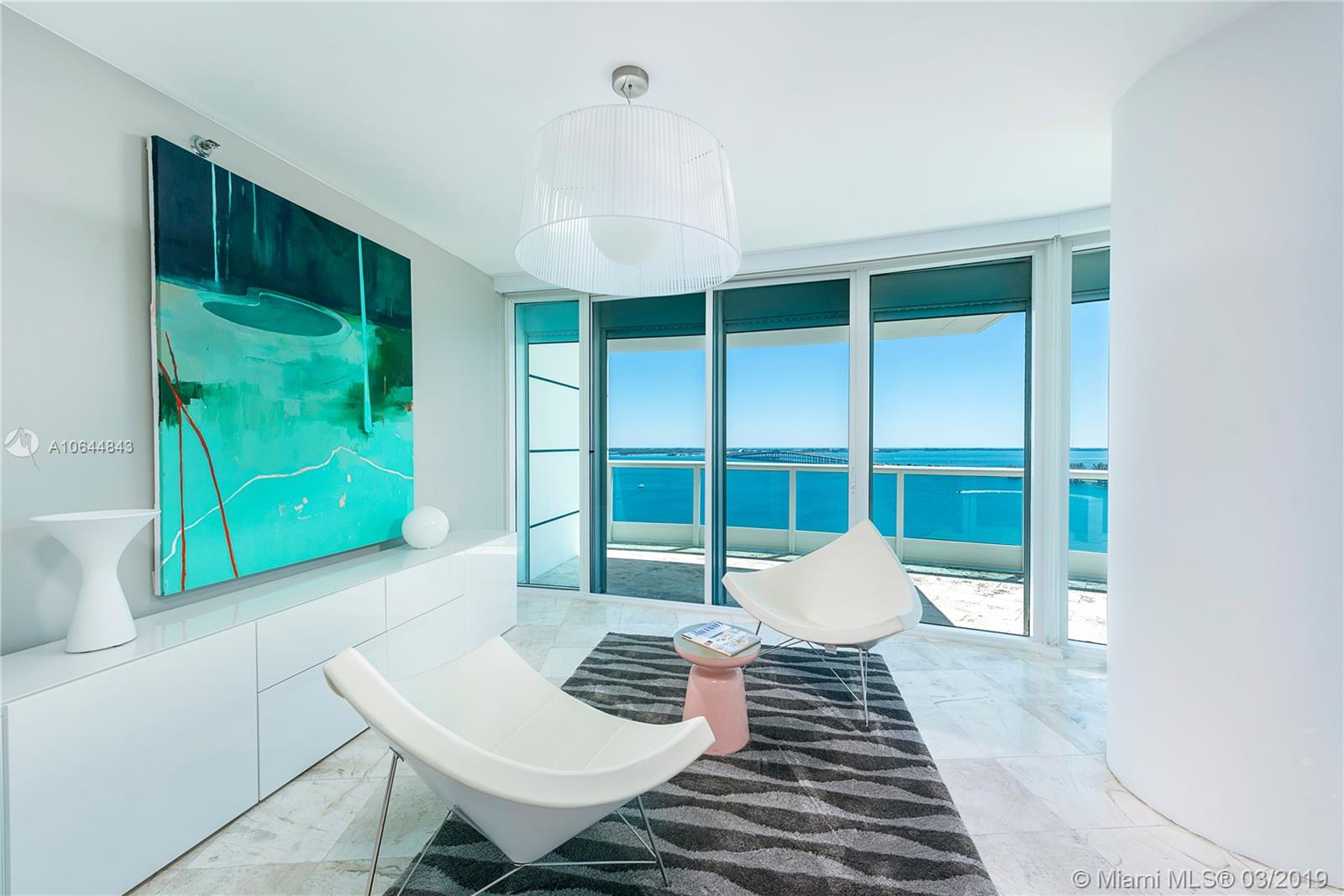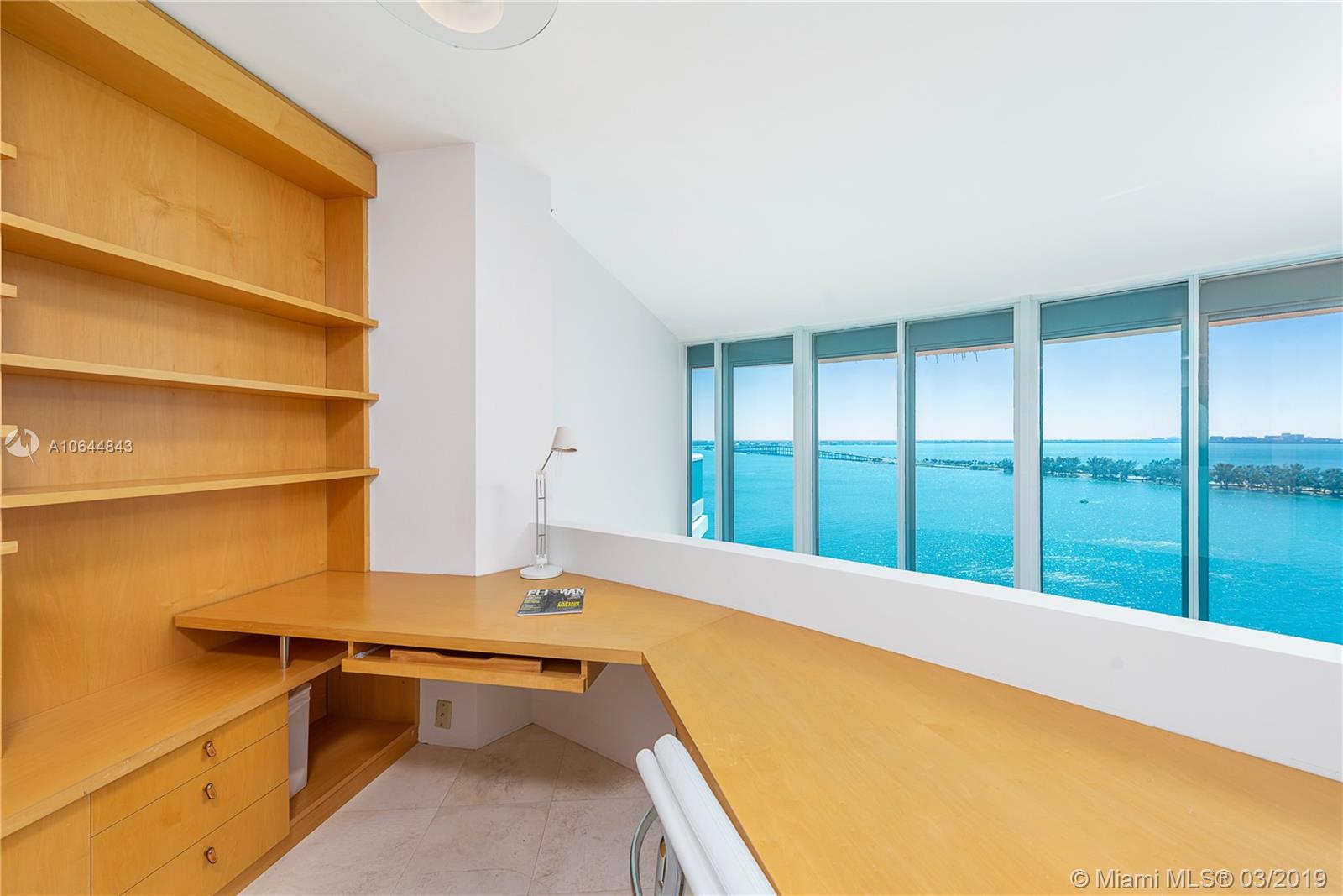 Distinguished Full Service Ugo Columbo building. Highest floor all waterfront Townhome (floors 18/19th ) double height 50 ft wide great room w/floor to ceiling windows (approx. 18' Ht), & panoramic views of Biscayne Bay /Ocean from all rooms. approx 2700 sf interior plus approx 700 sf waterfront wrapped terraces from all principle rooms. 2 Bedroom Suites & Office & Den. 3Ba & Powder room. Stone main floor w/ gracious foyer & wide stone stair to upstairs. Master w/ own terrace, two WIC, two baths & linen. Guest with Bth, own terrace, WIC and 2 linens. Ample storage throughout. 3 parking spaces, Concierge, Tennis, fitness, coffee shop. Kitchen w/ New stainless appliances. Laundry room. Millionaires mile location close to upscale shops & dining, I-95 & KB.