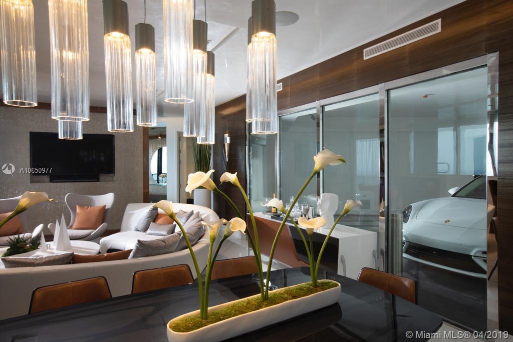 THE MOST BEAUTIFULLY FINISHED UNIT AT THE PORSCHE DESIGN TOWER! This 3 bedroom custom designer finished mansion in the sky was designed by Steven G with high end finishes all throughout. Featuring a gorgeously finished 2 car garage in the living room and a heated salt water pool on the balcony. Enjoy living in the only building you can drive into your apartment with your car. Residence includes Miele appliances, private elevator, private restaurant with in room dining, building concierge, car concierge, full beach service, two pools, spa, car simulator, sports simulator, movie theatre, salon, and party room. Enjoy five star resort like living in one of the most technologically advanced, private, and secure building in the world!