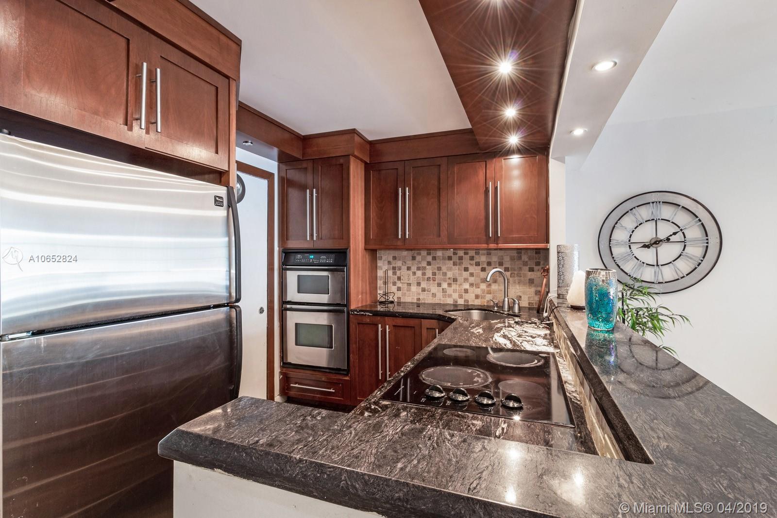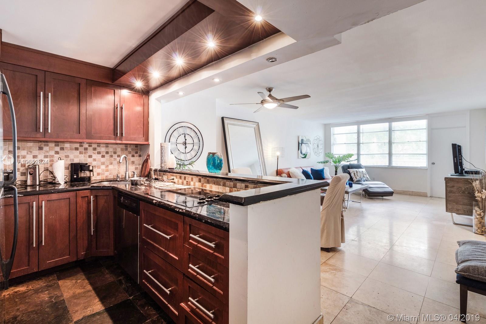 Charming 1 bedroom 1,5 bathroom unit in Normandy Isles. Quiet building and neighborhood with pool and gym. Kitchen and bath renovated in 2010. This open kitchen set up has wood cabinets and granite counters. Tile floors throughout. Lots of closet space and track lighting. The balcony gives you water views and all with a reasonable maintenance. 1 Parking space and cable is included with Maintenance.