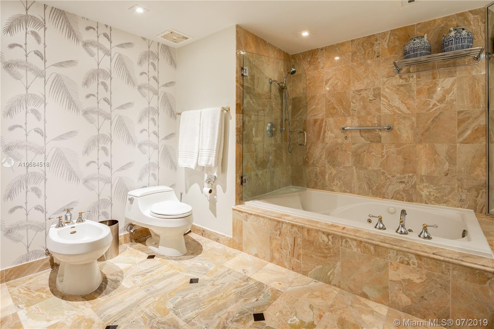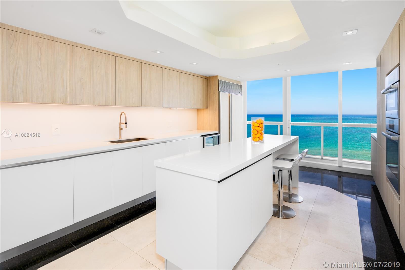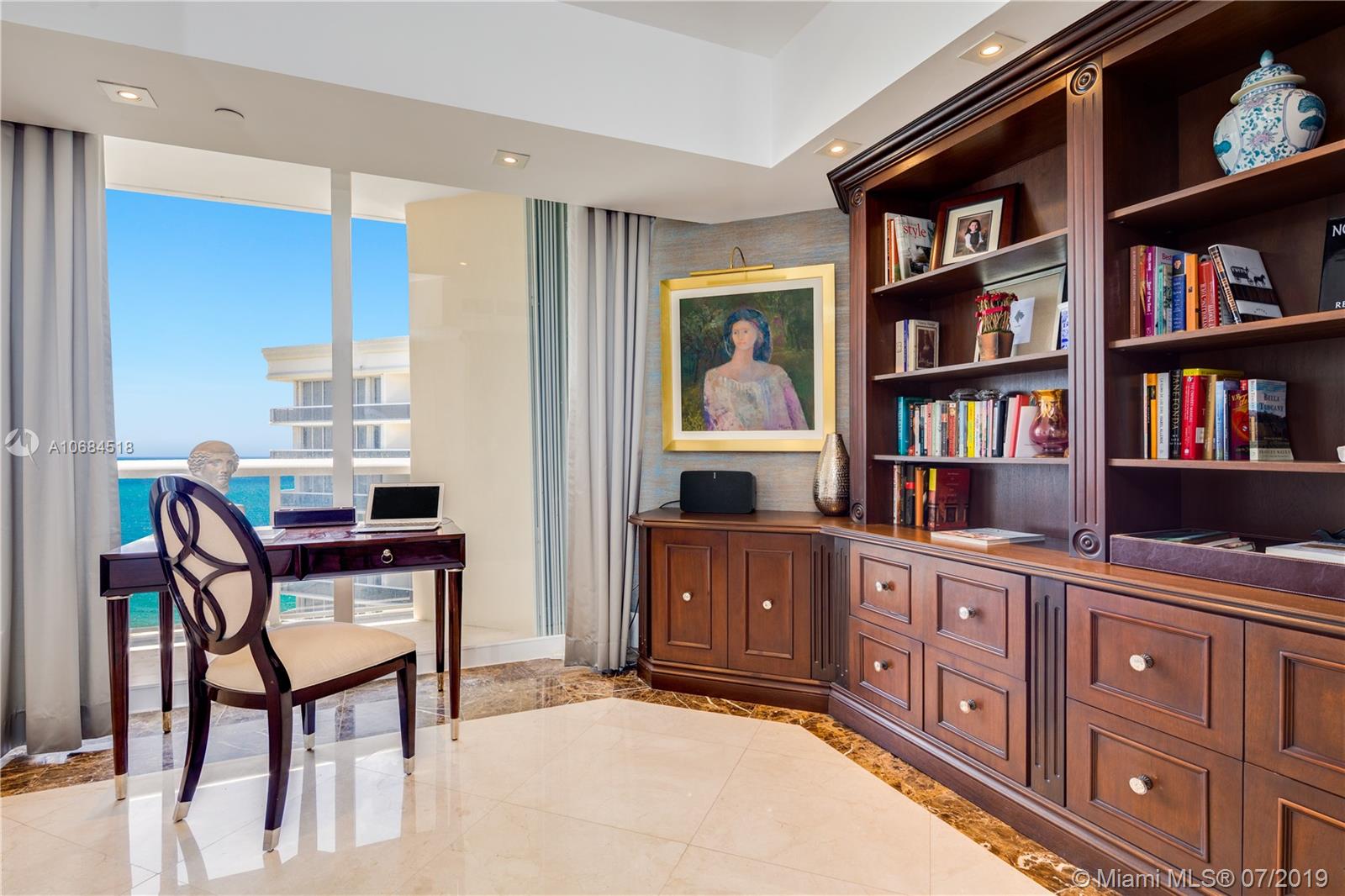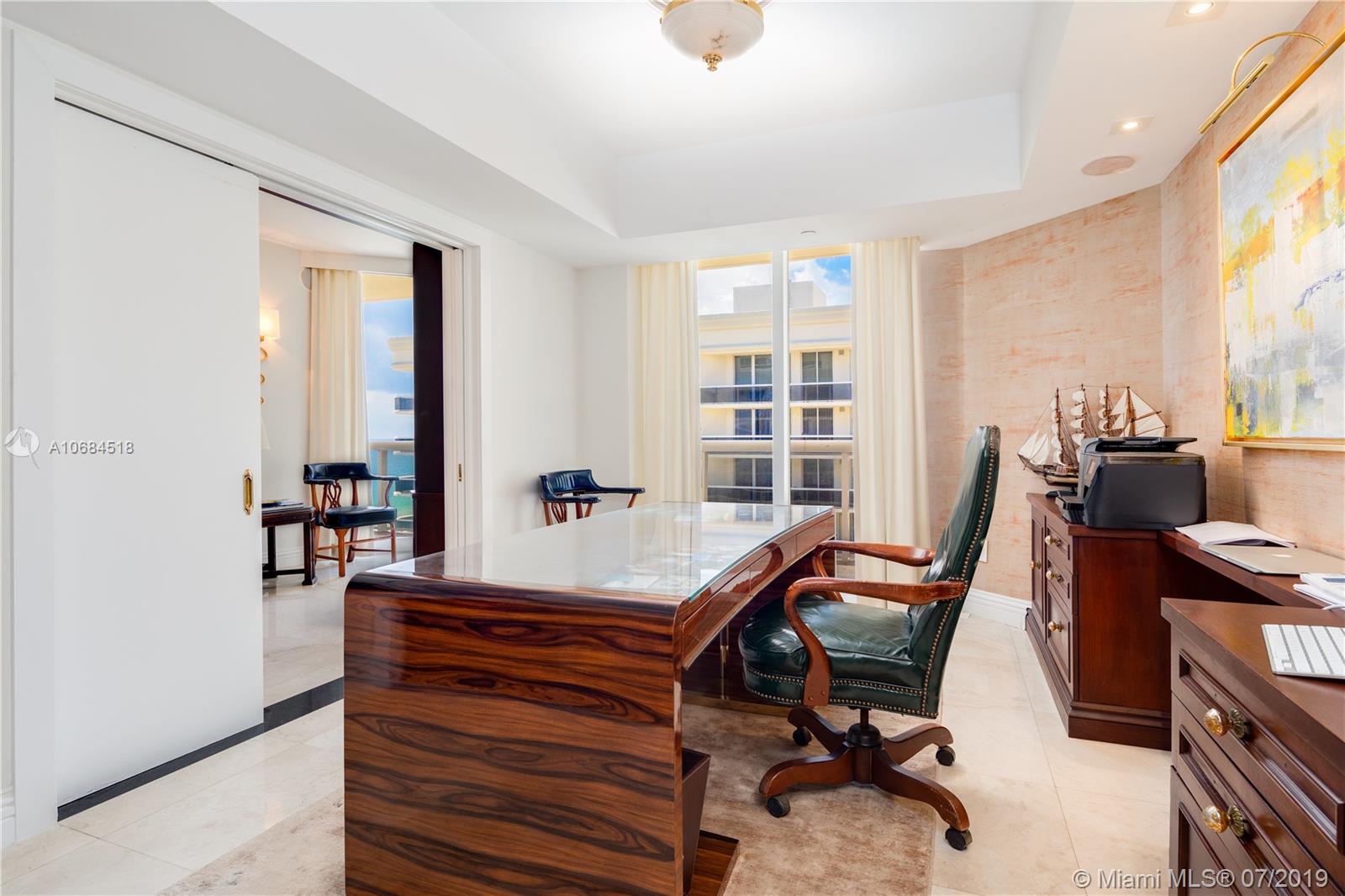 One-of-a-kind unit at the luxury Solimar in Surfside. Owner combined 3 units from the developer and into one for a spacious 6 bedroom, 5 bathroom, 2 half bath, and 6,230 sf unit. Take private elevator to foyer entrance and immediately be greeted by panoramic ocean views with flow-through layout. Unit offers large living room, dining room, family room, library, private office, balconies, maid's quarter, bar & entertainment area, and master suite with large walk-in closet. Building has 5 star amenities including 24 hour security, valet, pool + beach service, gym and unit includes 220 sf cabana. Great location across from the Bal Harbour Shops and adjacent to the shops of Harding Ave.
