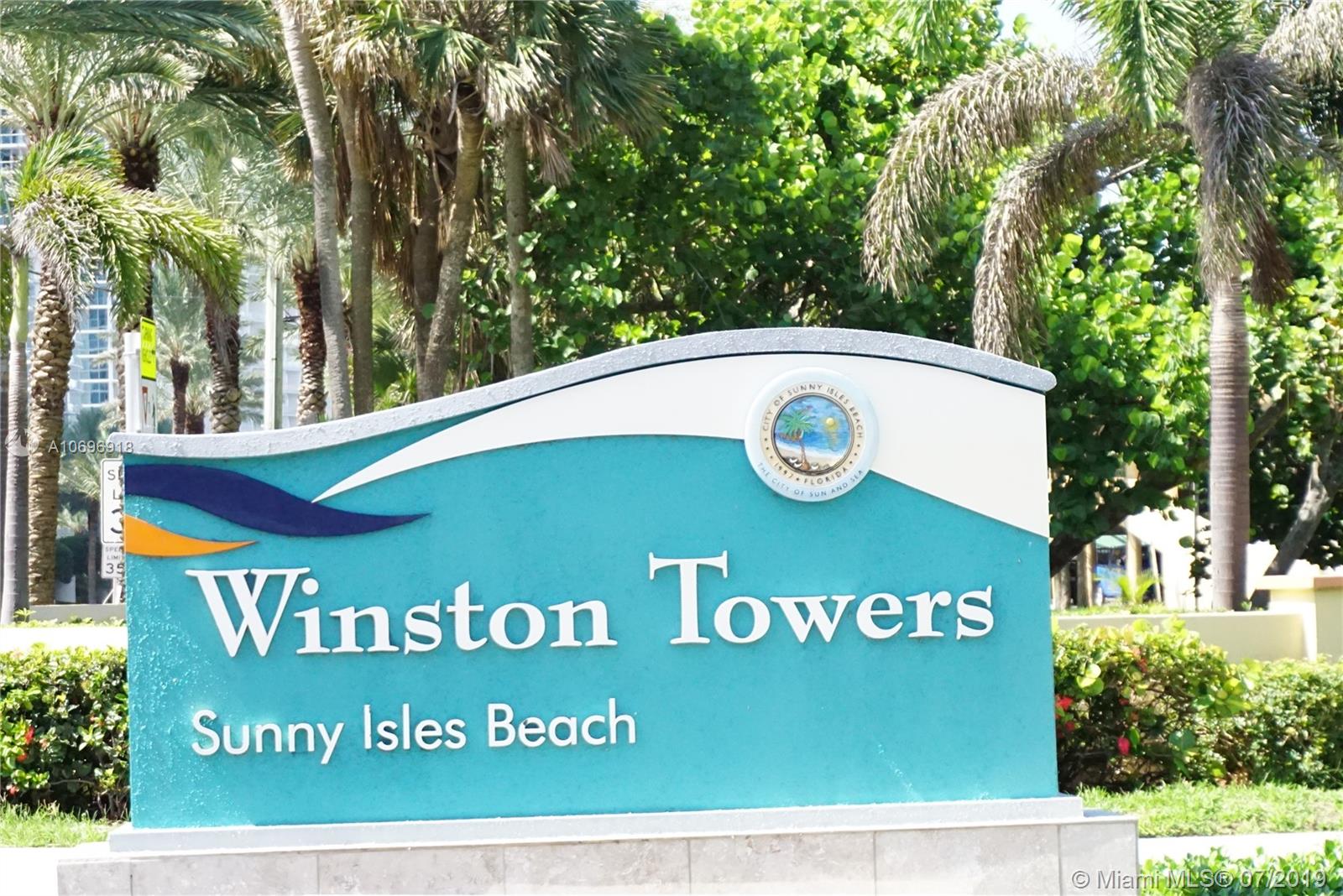 EXCELLENT VALUE - Ideal location, only a few minutes walk from stunning Sunny Isles' beach, shops and restaurants. Move-in ready spacious unit with 2 bed 2 bath split format. Eat in Kitchen, formal dining area, Good sized master bedroom with ensuite bathroom, large closets and extensive storage. Enjoy the view from the balcony. The amenities at Winston Towers include; 24 hour security, heated community pool, gym, sauna, library, game room and billiard room. Included in the maintenance fee: basic internet/cable, appliance maintenance insurance, water, trash removal, recreational facilities and security. Viewing by scheduled appointment - call today!