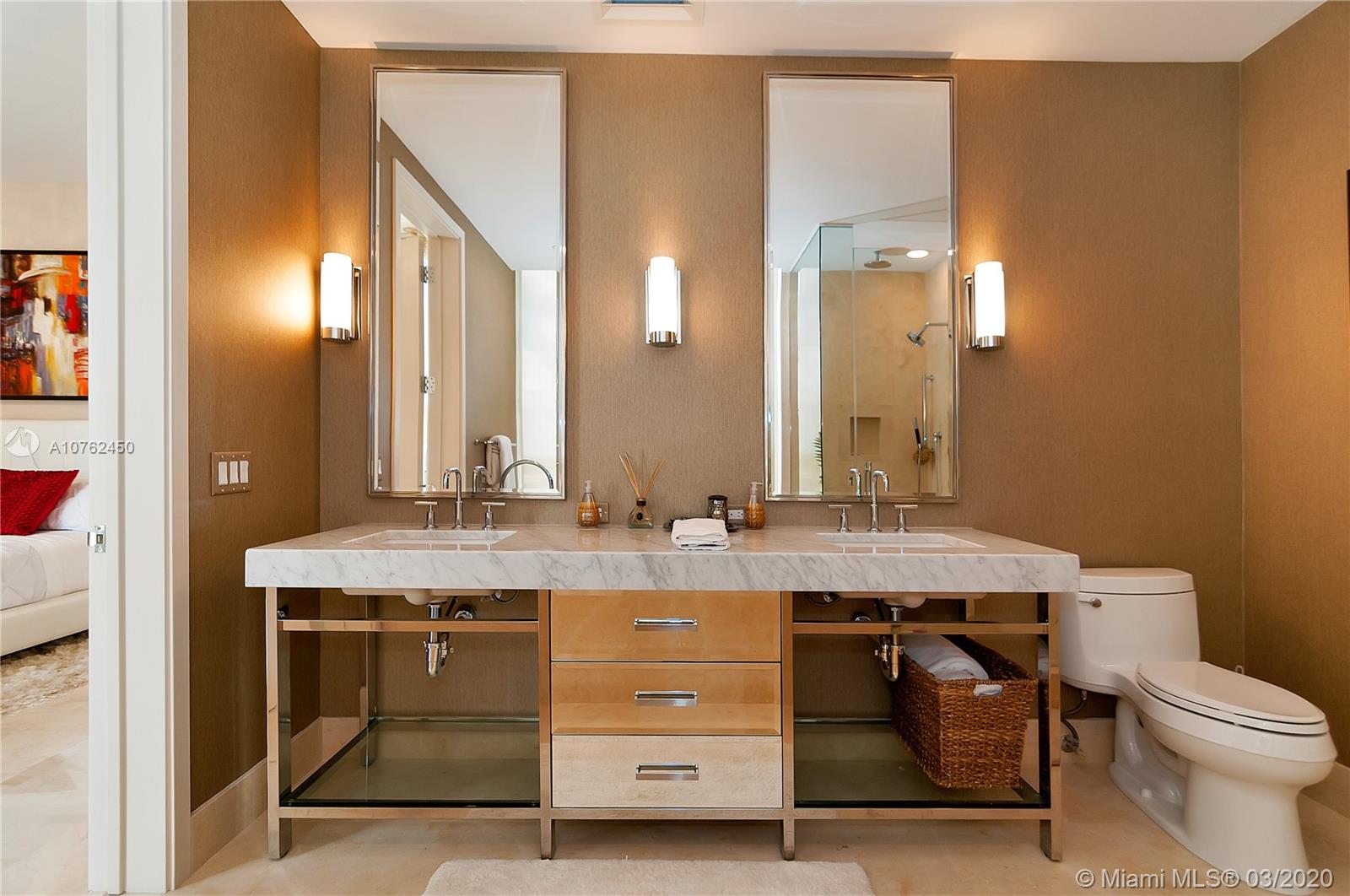 Welcome to one and only, ST REGIS-BAL HARBOUR, lifestyle experience with world class amenities, located right across from our world famous Bal Harbour Shops. This fabulous 2bed/2.5baths residence in the sky, just shy of 1800 sqft of Living area + one of kind terrace (1777 AS PER DEVELOPER'S FLOOR PLAN), comes with amazing, entertaining city and water views, luxurious finishes such as; spectacular marble floors, beautiful imported cabinetry and fixtures throughout, motorized window treatments, customized built-in closets, high end appliances, with a fantastic Thermador Gas stove! This marvelous unit is offered turn key, professionally decorated by famous interior designer, Steven G. Design. Ready to move in!