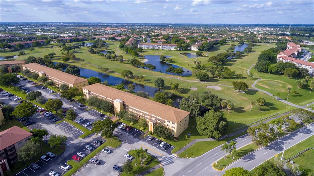 Welcome home to this 2 bedroom 1.5 bath condo. Enjoy the beautiful golf course and water view from the large screened in balcony. Terrace off the master bedroom has glassed in option. Hurricane shutters, laminate floors throughout, updated kitchen and baths ready to call home! Assigned parking space and plenty of guest parking. Convenient elevator access. IMPRESSIVE AMENITIES;135,000 sq. foot clubhouse, 1,042 seat theater, 23 indoor & outdoor heated pools, movie theater, health club facility, community buses, and many activities & classes.