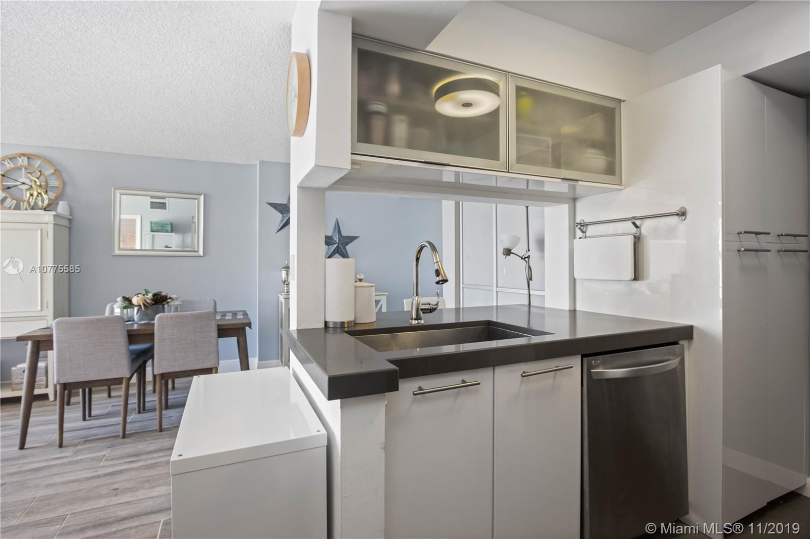 A must see HIDDEN GEM! This wonderful 1/1 has been fully renovated with a beautiful new bathroom and kitchen. Tranquil South facing water views of the canal and the Zen slate stone balcony overlook the pool. Elegant Quartz counter tops, stainless steel appliances, accents of glass and porcelain tiles throughout. Custom made California Closets make this updated condo extra luxurious. Also equipped with a tank-less water heater W/D, and a recently replaced AC unit. 6 Month Minimum Rental. No Airbnb. 1 assigned parking space.