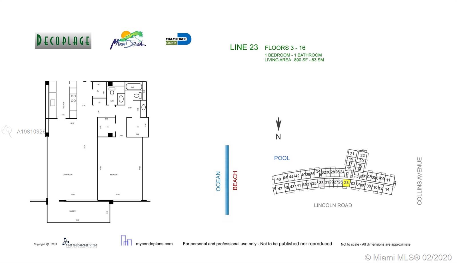 GREAT PRICE ON THE BEACH: Large 1 bedroom, 1 and a half bathroom apartment in the direct ocean, "Decoplage" South Beach building. Open concept kitchen. Large bedroom with plenty of closet space. The building offers top of the line amenities, such as a swimming pool and direct beach access from the pool deck. Well located in the heart of South Beach, near restaurants and the famous Lincoln Road Mall. Just bring your luggage and enjoy the resort lifestyle offered at the Decoplage. Under certain conditions, City of Miami Beach and the building authorize 1 month minimum short term rentals. Special assessment of $331.87 per month until August 2021.