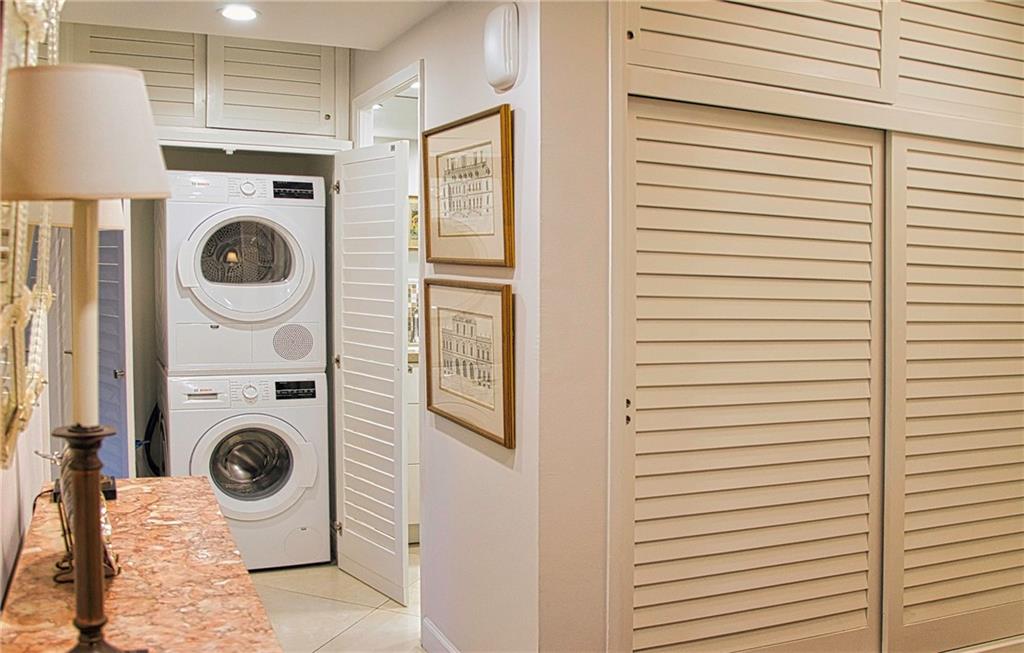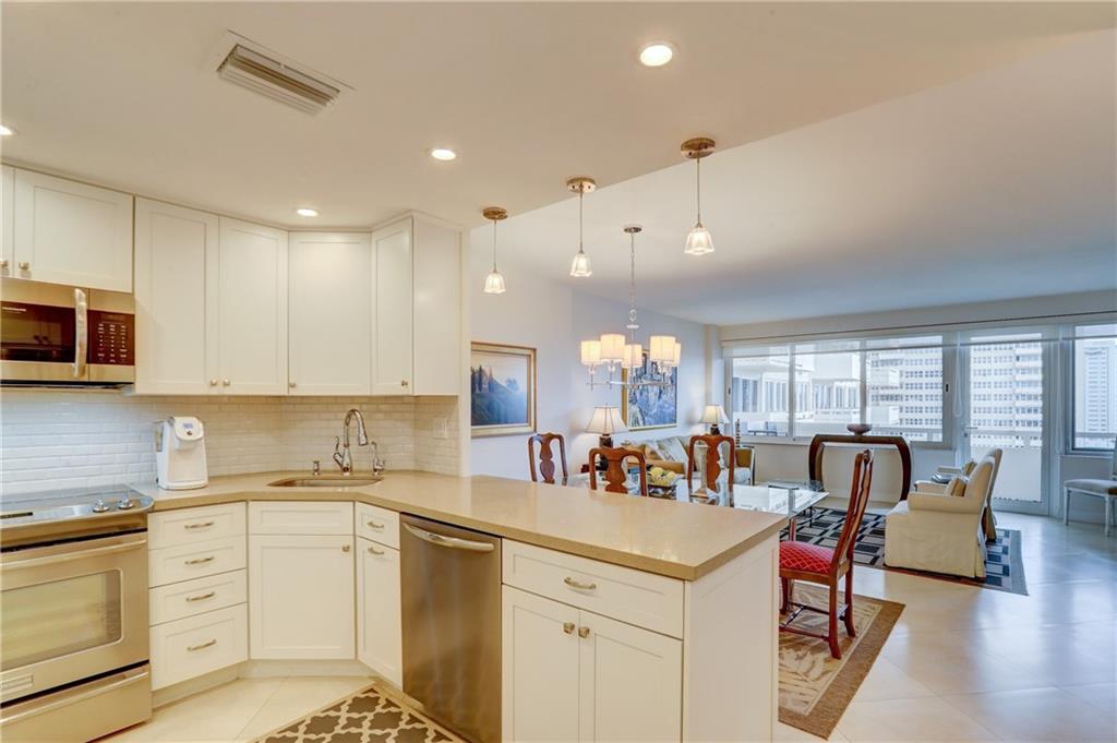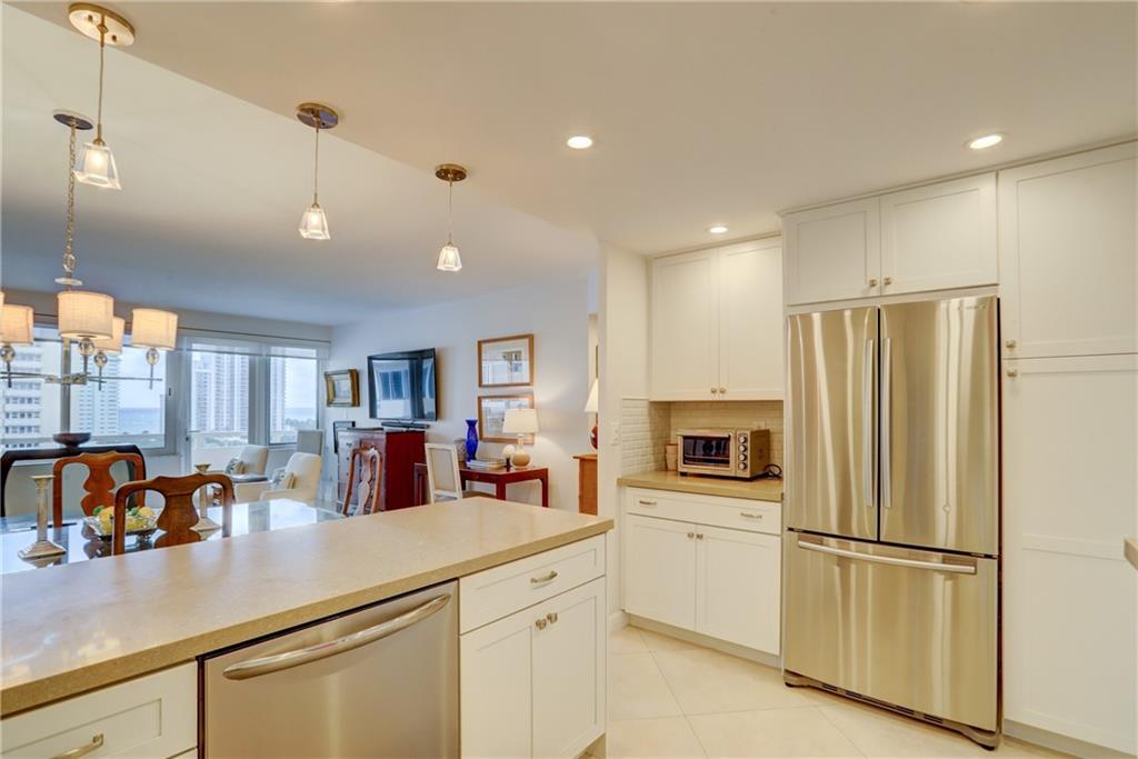 This stunning, model condition, ocean facing, hi-floor apartment has been appointed with the most discriminating of tastes. It’s been thoughtfully designed in a neutral palette from its high-end Kraft-made cabinetry, to sleek modern Italian 30” tile floor running throughout. The kitchen backsplash lined in subway tile frames the Frigidaire Gallery collection of appliances and a full-sized Samsung French drawer refrigerator. A GE water filtration system keeps your water fresh and clean tasting. This sky retreat offers a spa like master bath with frame-less walk-in shower and European tiled accent walls. Its hurricane impact windows are treated with custom shades. This apartment includes a Bosch Washer/Dryer and Eco Smart tank-less water heater, rare features in few units in the building.