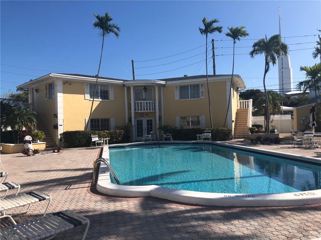 Corner unit on first floor in back of building (away from the street). Well maintained unit that comes fully furnished. Newer central a/c and water heater. Tile flooring throughout entire unit. Half bath in master bedroom. Guest bathroom has walk-in shower that's updated. Spacious living area with extra full closet in dining room. Easy access to parking. Complex has nice laundry rooms that are not far away. Huge community pool and community room as well. Quiet maintained complex. Awesome location just a block from Federal Highway and close to all major shopping, restaurants and the beach.