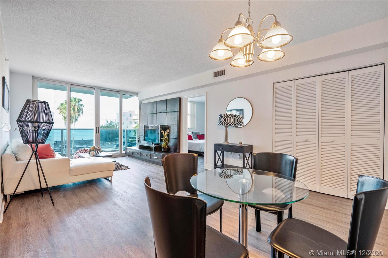 MODERN REMODELED MOVE-IN READY MIAMI BEACH CONDO ON QUIET STREET- Pack your bags and move into this cozy 2 beds 2 baths apartment in secluded area of Miami Beach. Access the private balcony thru floor to ceiling windows and enjoy the beautiful water views from this corner unit. Open floor plan and spacious bright rooms provide a home feeling. New engineered wood floors throughout. Impact windows. Stainless steel appliances with newer appliances. Very well maintained building with new lobby, valet, pool, gym, board-walk and convenience store. Pet friendly building. PERFECT PIED-A-TERRE IN MIAMI. Vacant and easy to show.
