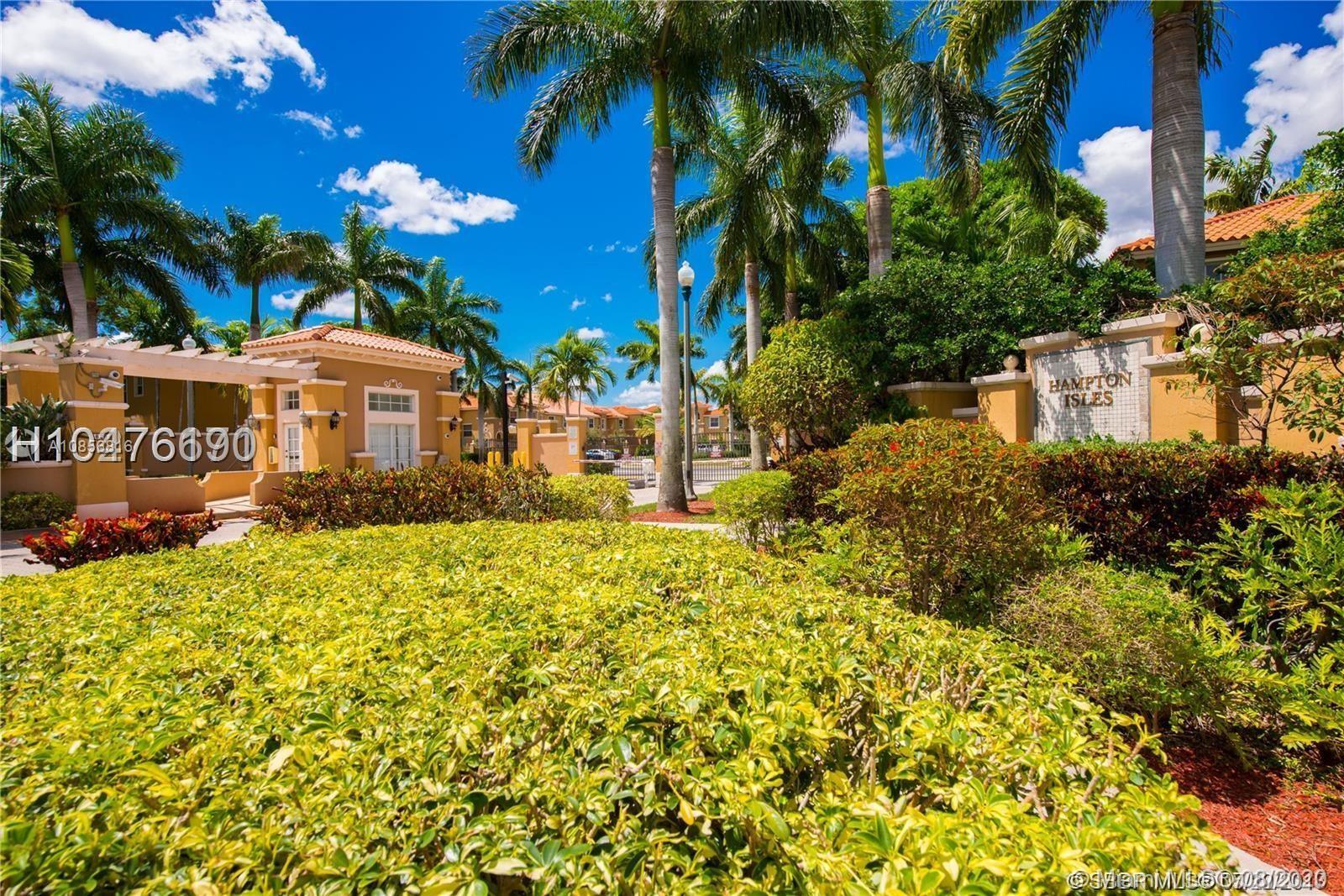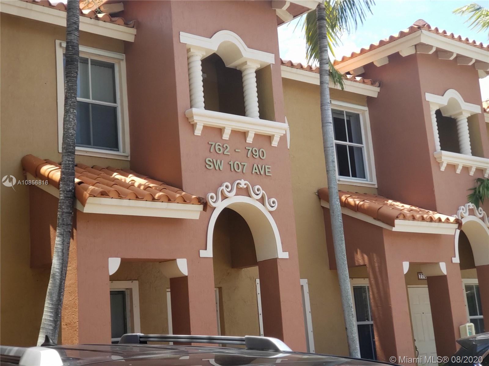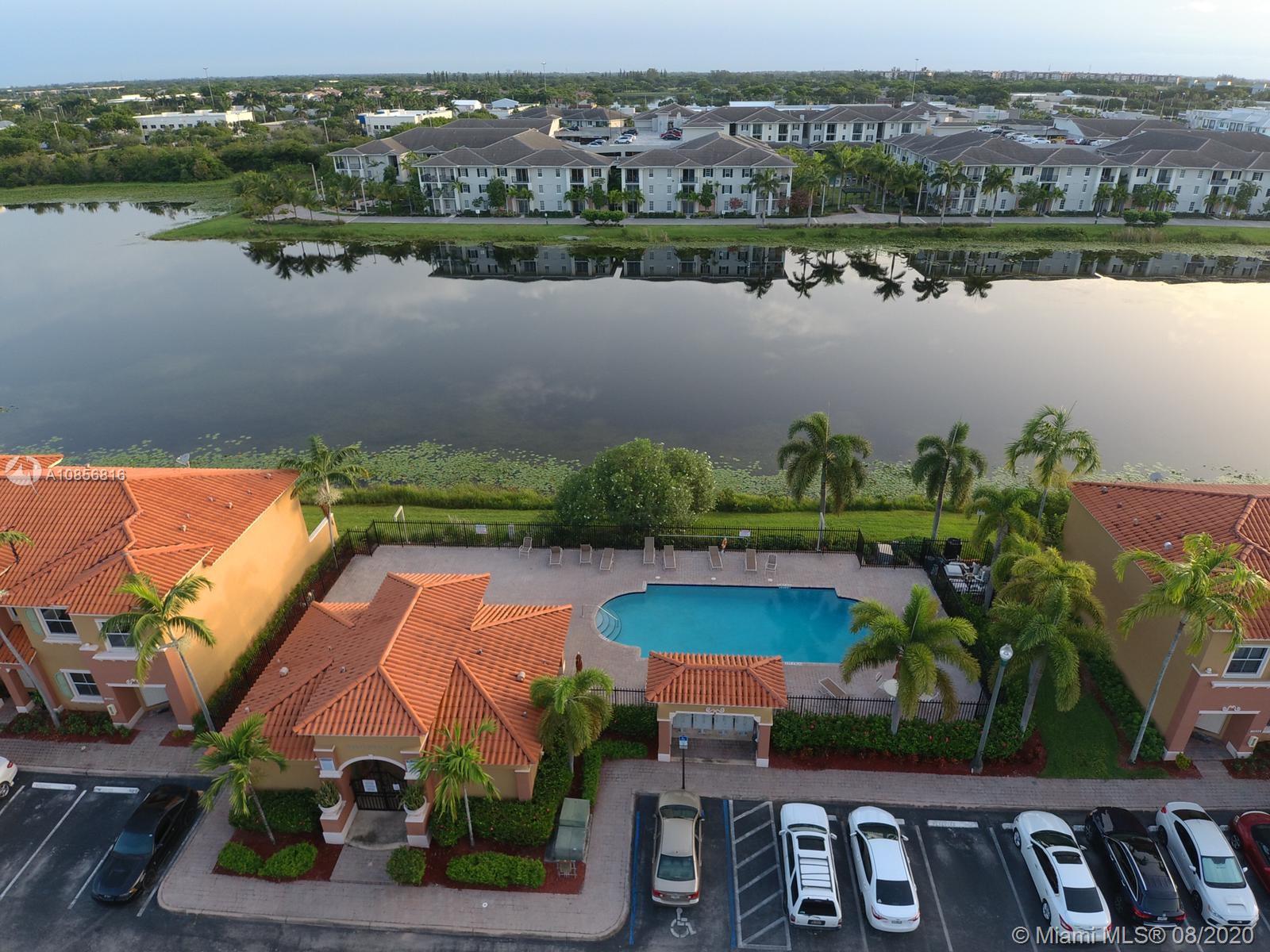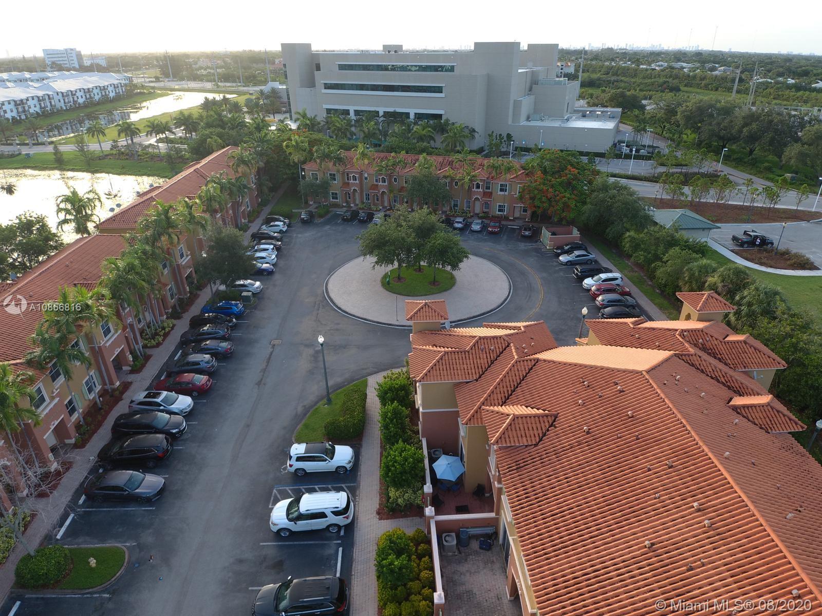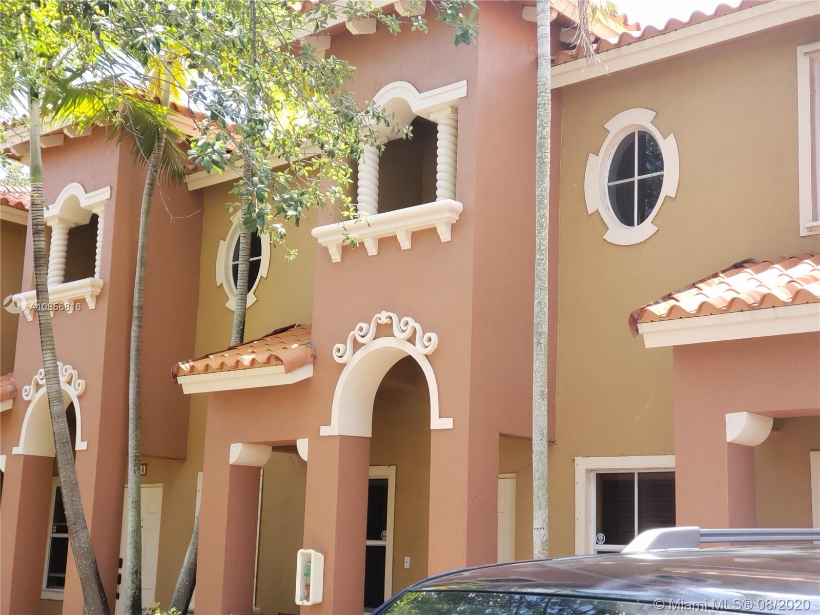 In gated Mediterranean styled community. Ceramic tiles downstairs, with Berber carpet upstairs thru to landing bedrooms & closets. This model has two (2) Master Suites upstairs, split bedroom plan. Both with walk in closets. Includes a laundry closet with full sized washer & dryer. Spacious brick paved patio in back to relax and entertain, or for children to play. Walk to pool over looking lake view. This unit is walking distance to the new City Center, and shopping, close to gym, restaurants & Pembroke Lakes mall. Comes with fitted hurricane panels. Association requires each person 18+ to have credit scores of at least 650. Park in #304 there are two reserved spots.