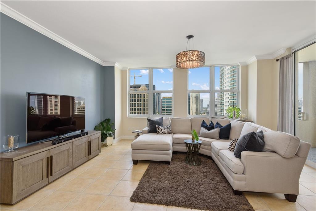 Views that will never be taken away! Experience incredible city, river & ocean views from every room & balcony. This 3 bedroom / 2 bath corner residence is located directly along the New River. It features beautiful crown molding throughout, wood flooring in owner’s suite & a storage cage. Owner’s suite also boasts custom walk-in closet, roman tub/shower w/ modern glass enclosure & double sink vanity w/ tons of storage. Stone countertops & backsplash, modern Italian shaker style cabinetry, upgraded stainless steel appliances & picture window facing the ocean makes this kitchen a pleasure to cook in. 2 additional bedrooms w/ custom built-in closets, a full bath w/ sleek glass tub/shower enclosure welcomes guests or makes for an efficient home office space or nursery depending on your needs.