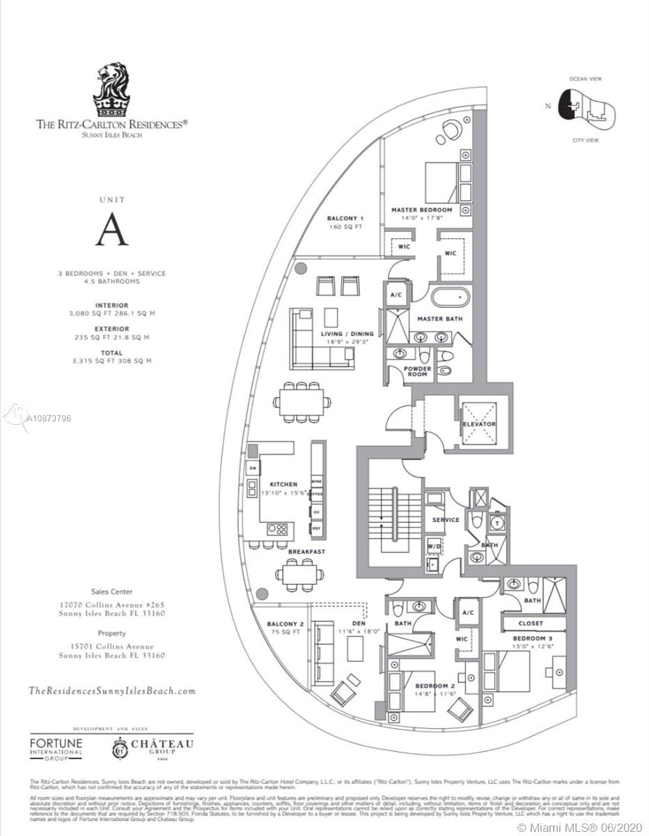 Experience Luxury Living at Ritz-Carlton Residences Sunny Isles Beach. Zip up to your residence in a private elevator. North corner, 10' foot ceiling, flow- through unit with breathtaking direct ocean and intracoastal views, 2 terraces and lots of natural light. Spacious floor plan with 3,080 sq ft. of living space and 3,315 sq ft. total area. 3 bedrooms, 4.5 bathrooms, den, and service quarters. Snaidero kitchen cabinetry, wine cooler, Gaggenau appliances, featuring interiors by Italian designer Michele Bonan. Decorator ready. Luxury amenities include: fitness center, guests suites, Ritz-Carlton restaurant, concierge, full beach & pool services, 2 swimming pools, movie theater, oceanfront gym and Spa, Wine lounge, Cigar lounge, Game room and more.