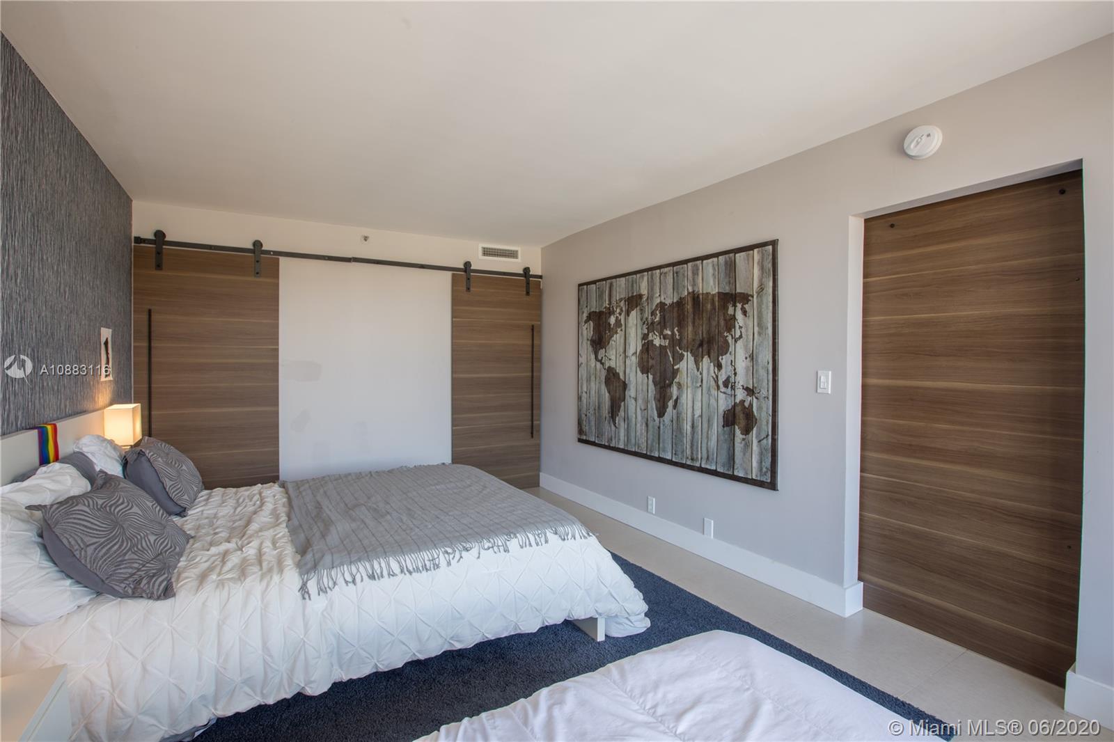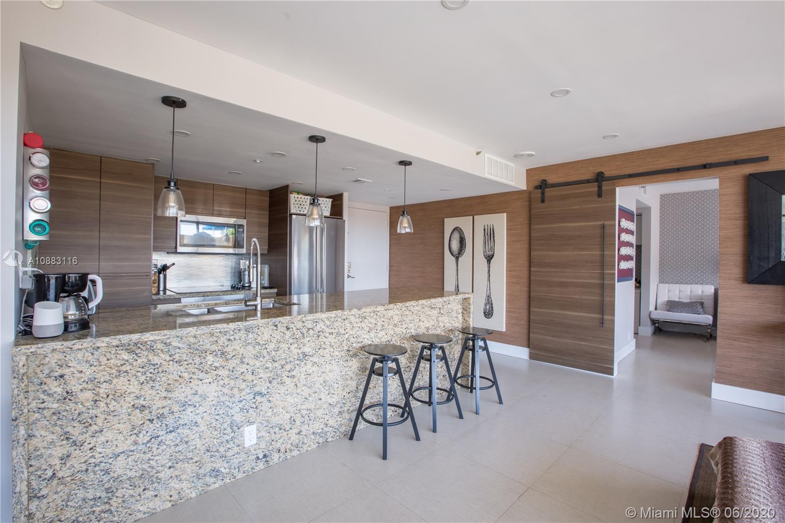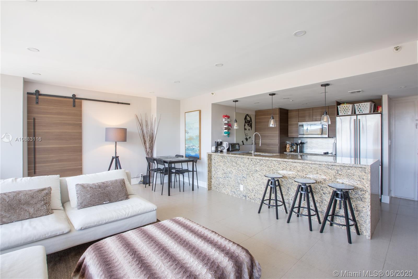 Unique opportunity! Totally remodeled 2/2 unit has been professionally decorated. No expense was spared on this immaculate interior! Italian porcelain floors, accent walls, barn doors, brand new SS appliances, open kitchen with granite counter tops, custom built closets, floor to ceiling windows, balcony, washer & dryer inside the unit! This is a waterfront building with marina. Amenities include 24 hour security, olympic sized pool, jacuzzi, gym, restaurant, beauty salon, and convenience store. Amazing location and less than 2 minutes from the beach. Easy access to I-95, Downtown Miami and Airports.