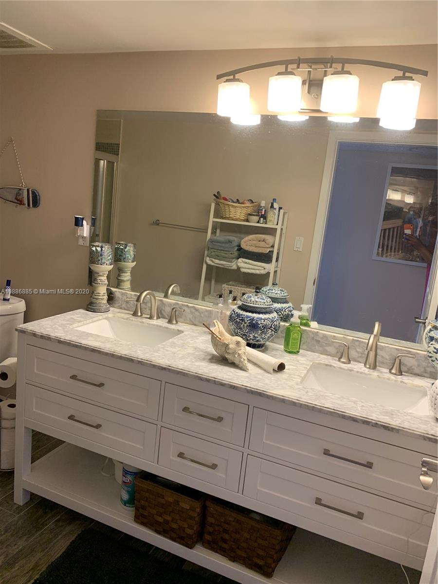 Beautiful corner unit with an unobstructed view of downtown Miami's skyline. This 2/2 split floor plan unit has hurricane impact windows and doors, and a bonus room that could be an office, family room or dining room. The unit was tastefully remodeled with new flooring throughout, double vanity sinks and soft-close shaker kitchen cabinets and a durable quartz counter top. There is attractive white crown molding and base boards throughout the unit. Each walk-in closet has custom shelving for ample storage. This unit is a must-see and will not last long.
