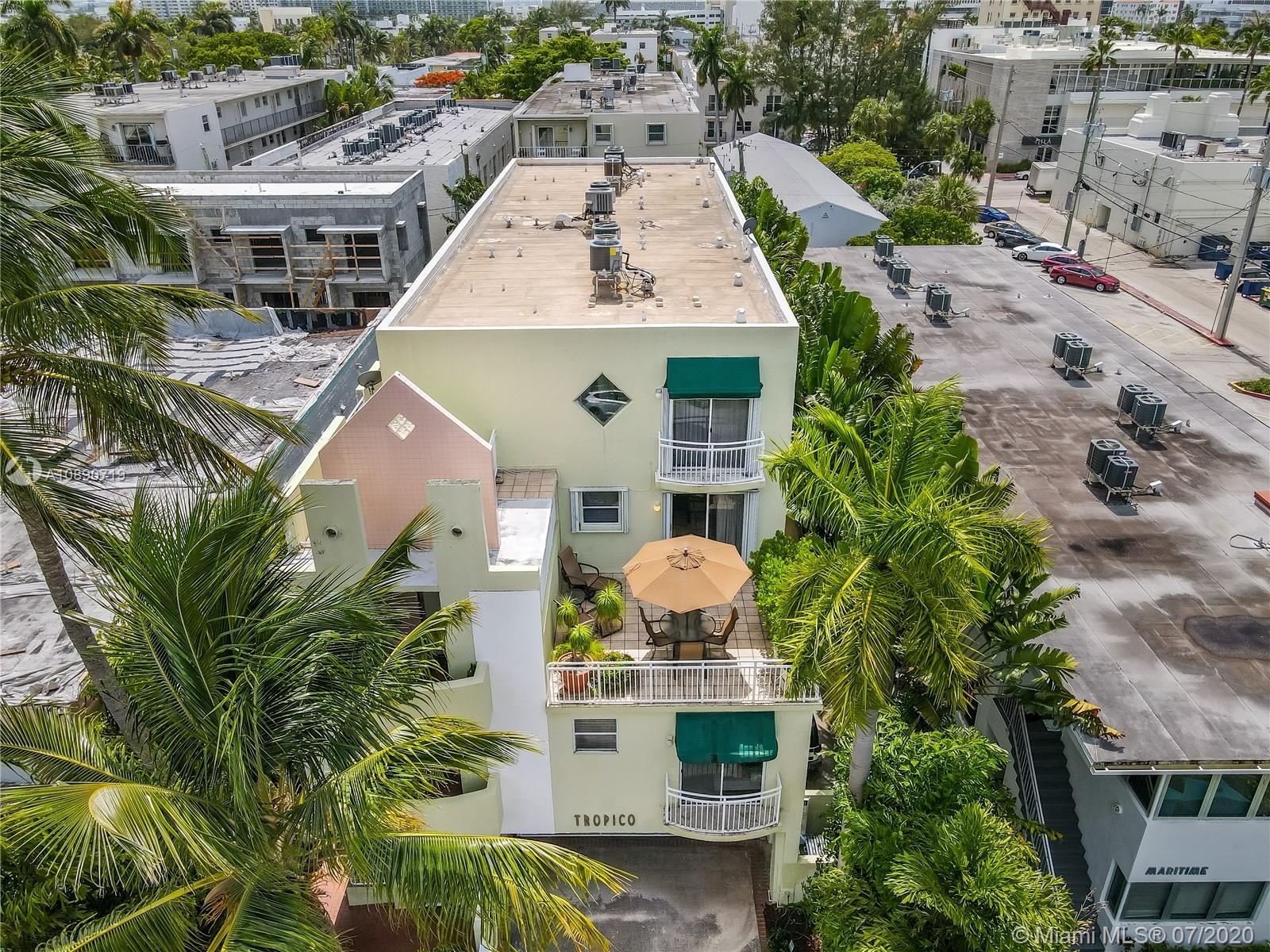 840 SF per condo docs. This bright and spacious two story home offers plenty of natural light with three exposures and THREE outdoor areas. Unique and rare, this is the best unit in the building with 2 bedrooms, split floorpan, 1.5 baths including washer and dryer, covered parking, solid wood cabinets, granite countertops, marble flooring, storage room and more! The large outdoor patio area is right off of the livingroom on the main level and faces east with great views of South Beach and Lincoln Road. The guest room has its own spacious balcony and the master bedroom also has a lovely balcony overlooking the patio and lush greenery. The Tropico Condo is located right in the heart of South Beach, steps to Lincoln Road and walking distance to the beach.