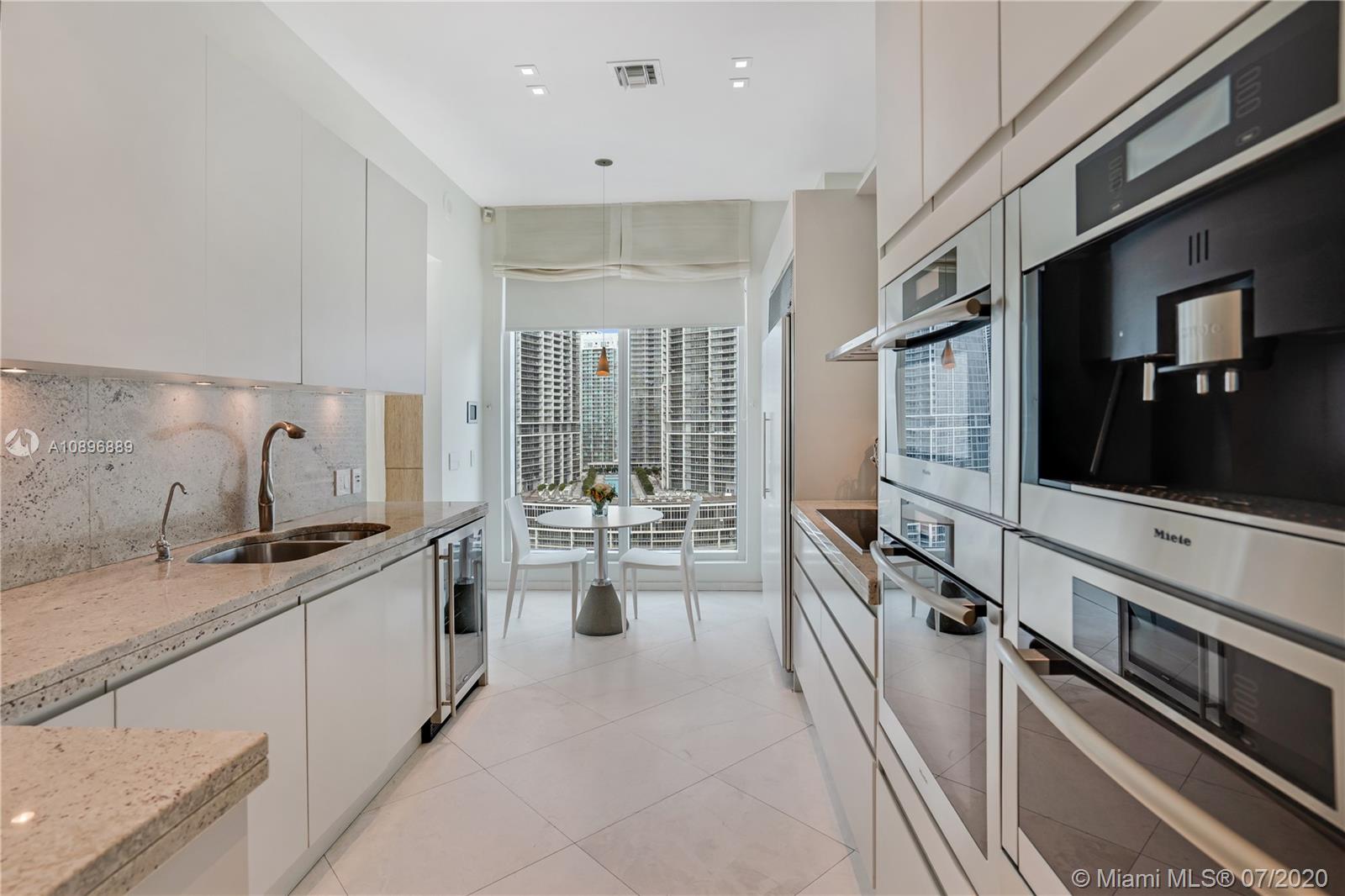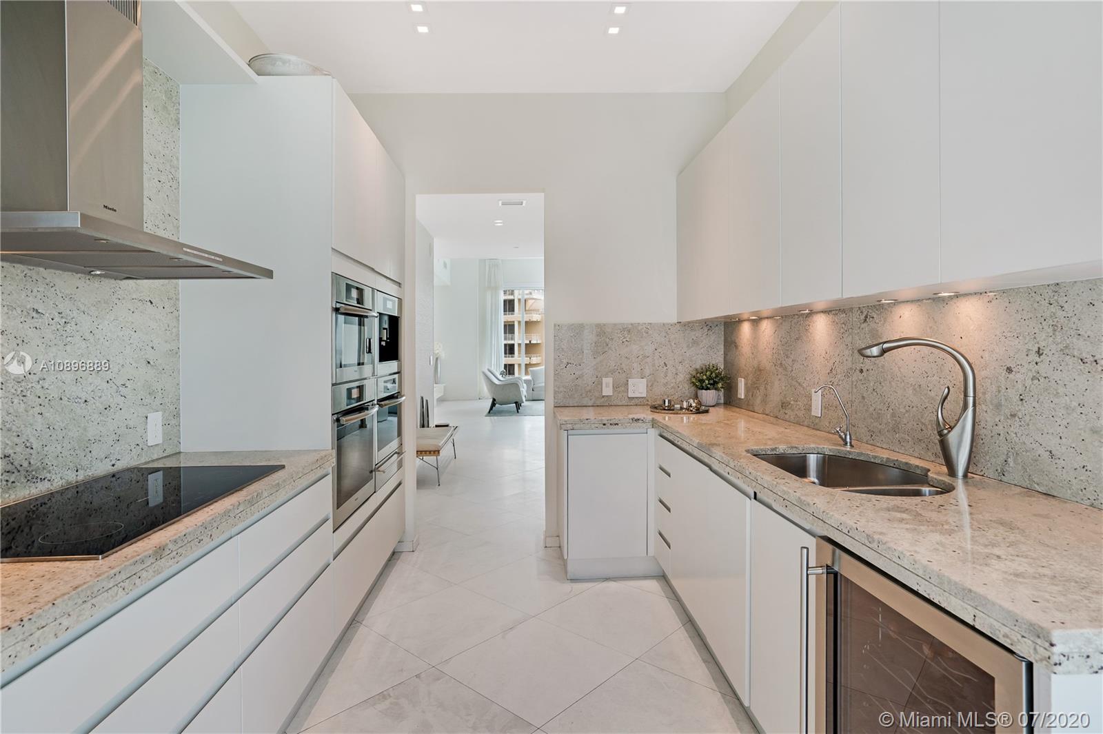 This corner unit provides for 180 degree views over the ocean, the bay, Brickell Key and Miami. This 4 bedroom, 2,631 SF residence offers soaring 12-ft ceilings, a private elevator, 4 large sunrise and sunset terraces & marble floors. The Gourmet kitchen boasts Italian countertops, wine cooler, built-in espresso machine, Miele Ovens with integrated microwave, Subzero refrigerator and ceramic cook tops. This unit comes with 2 assigned parking spaces and a storage. This high end condo on the gated island of Brickell Key comes with top of the line amenities such as a swimming and resistance pool, tennis courts, Jacuzzi, gym, a party room, 24/7 concierge and valet parking.