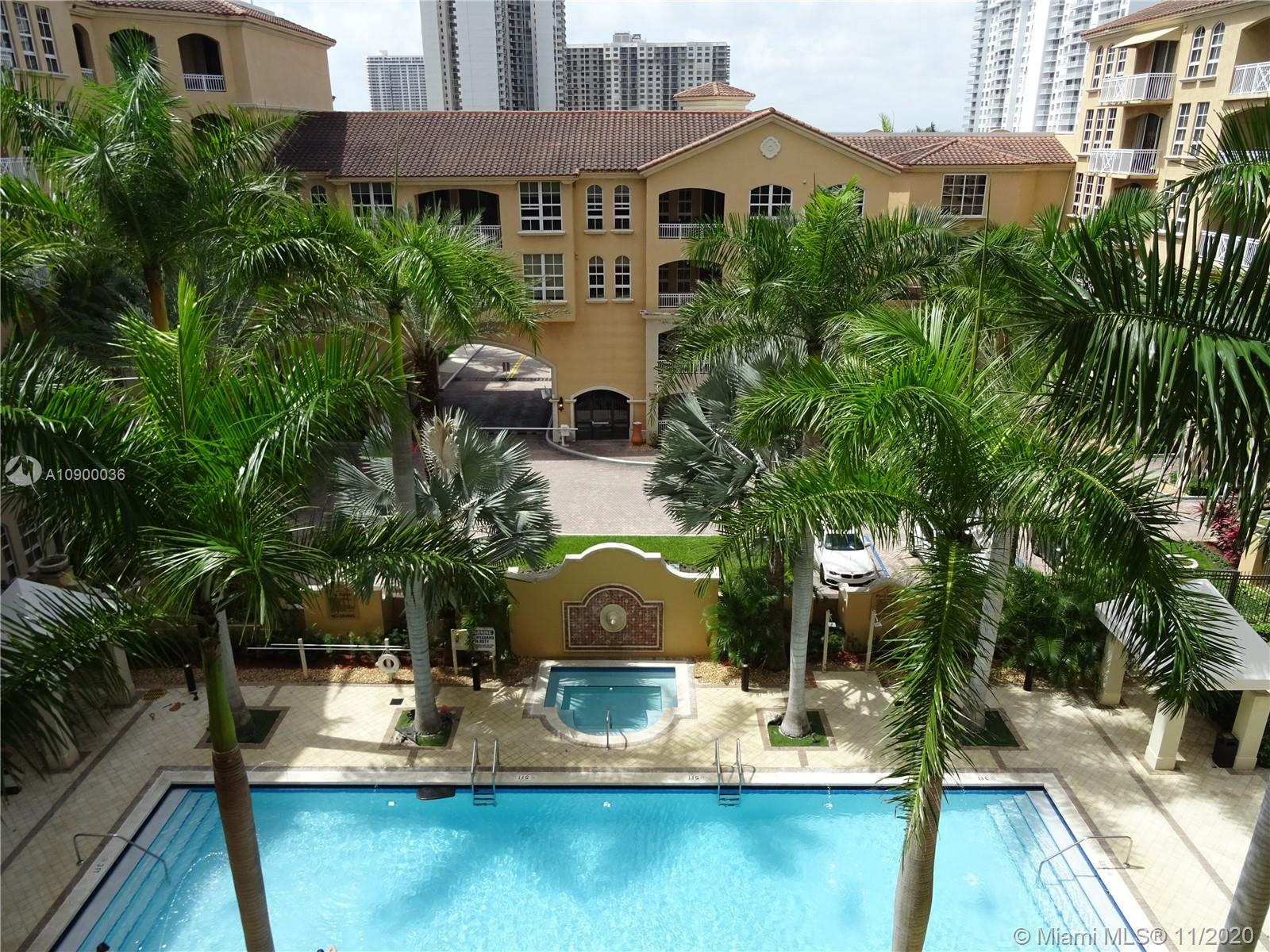 INVITING and spacious 2 beds 2 baths (1,343 sq.ft. - plus 2 terraces) residence located on the 5th floor with 10' high ceilings, fantastic floor plan w/ split bedrooms overlooking the pool area in the beautiful City of Aventura. Move-In Condition, Open kitchen with granite countertops, cherry wood cabinets, stainless steel appliances, huge bathrooms. Washer and Dryer inside of the unit. Alaqua is a Mediterranean style waterfront, gated community in a great location, great schools, house of worship, parks, just minutes away from the Aventura Mall and THE BEACH. Pets & Rental OK. 2 assigned/covered parking spaces & awesome amenities: tropical lushly landscaped pool area, Gym , Community Room and much more…