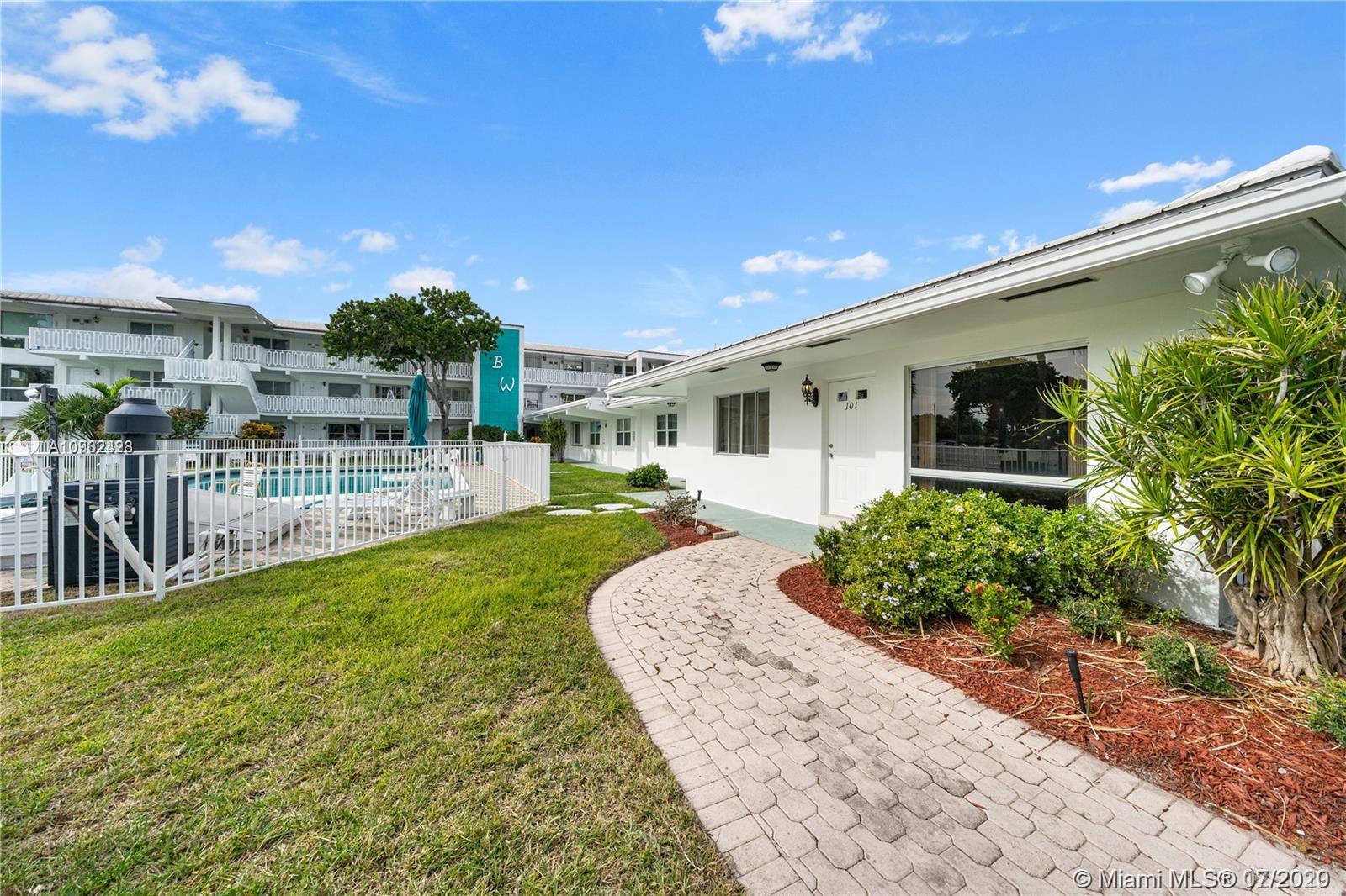 A rare opportunity! Spacious walk to the beach! Corner condo 1-story on ground floor Private pool. Everything included with all appliances, building laundry room steps away from condo. Private parking plus guest spaces. Short term rentals permitted. BBQ area near pool. Freshly painted building. Assessment paid by seller. Condo fee $490/month covers everything except electric. (Also available for rent and short term rent)