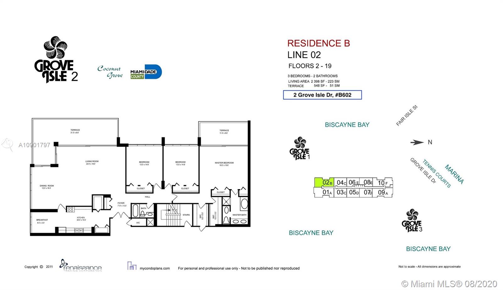 Lowest priced 3 bedroom, 2 bath in Grove Isle corner unit with unobstructed water views. Live on the only island in Coconut Grove while enjoying sunrises and sunsets from your own balconies. Paddleboard or kayak from the island's private beach or take a stroll to the Grove. Minutes away from the beach, downtown, business district and the airport.