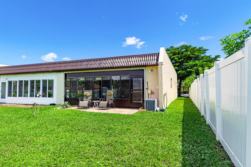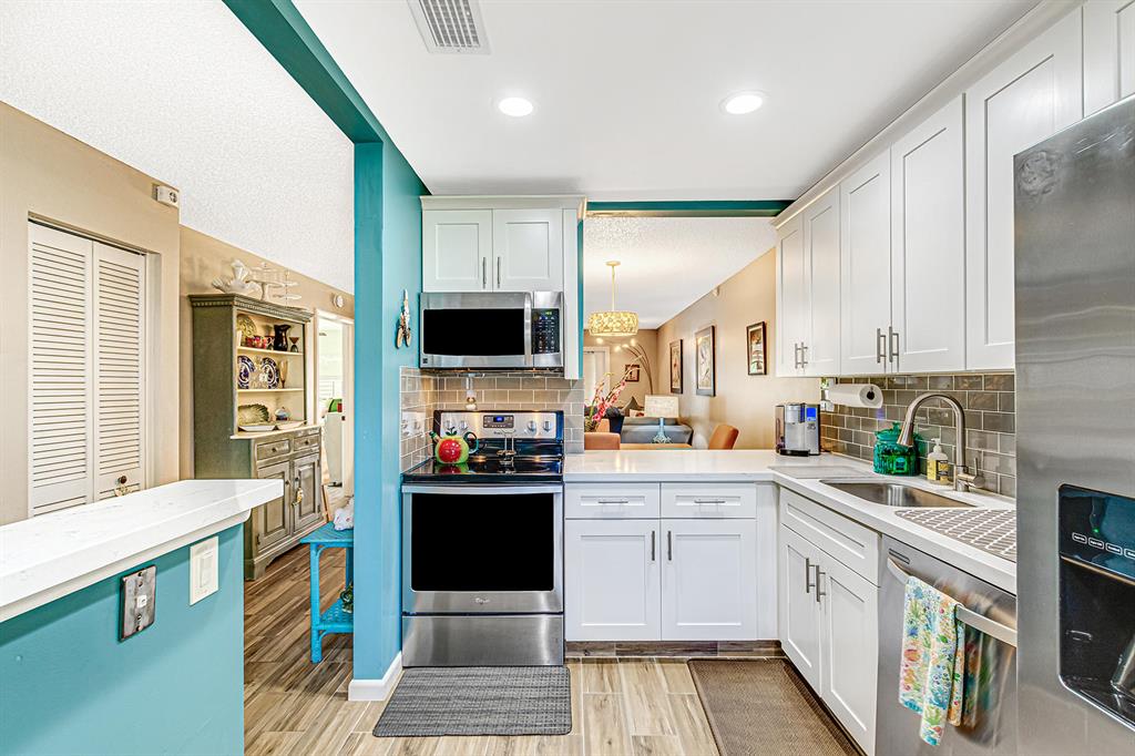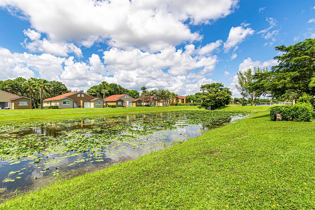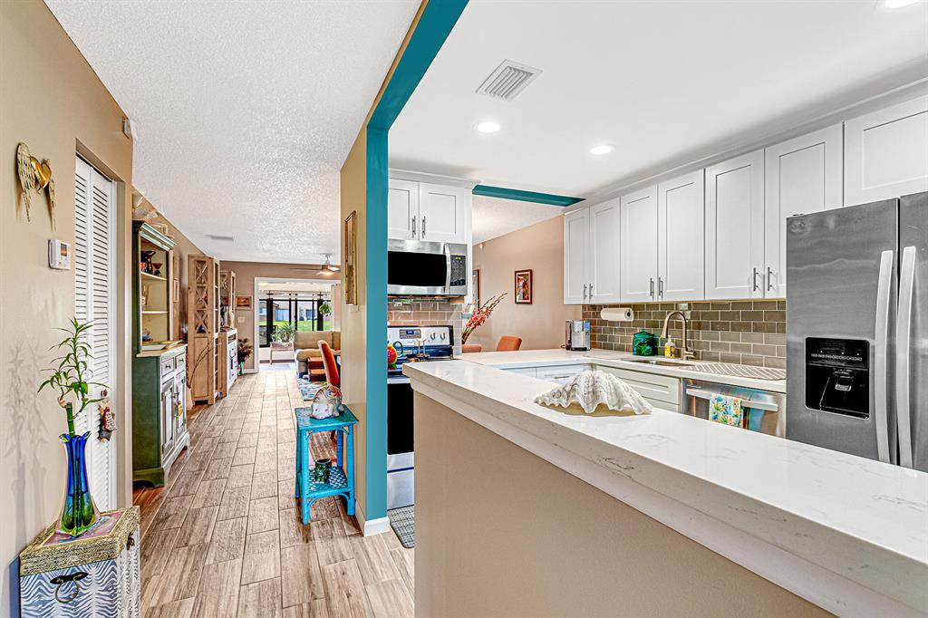 Gorgeous! Immaculate and tastefully renovated home. Beautifully updated Kitchen has solid wood cabinetry, quartz counter tops, designer subway glass tile backsplash and stainless steel appliances. Impact windows in Kitchen, Bedrooms and Bathroom. Exquisite porcelain wood plank flooring throughout. Both bathrooms have upgraded finishes that show so well.Covered, enclosed patio with full size washer and dryer overlooking a lovely water view. Roof replaced in 2019 and new gutters. Active Adult Community has a clubhouse with pool, fitness and game room. One small pet is permitted. Great central location with easy access to shopping, restaurants, beaches, makor thoroughfares and all that South Florid's lifestyle has to offer. Opportunity Knocks!