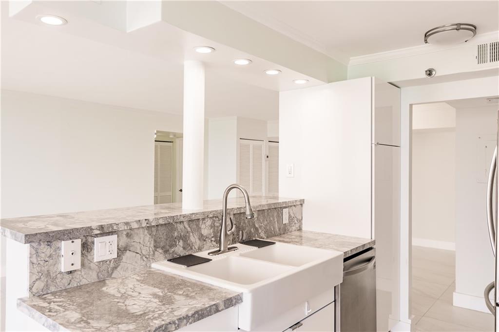 Wake up to see the Ocean from your Bed, spectacular views from three sliding glass doors, large balcony.Cross the street and you are on the Beach.Completely remodeled.Large 2Bed/2Bath. Beautiful new floors. New Bathrooms. Modern Kitchen with new appliances, Bar, and Breakfast area with sliding glass door to balcony. New washer/dryer in unit. Pool, Exercise room, Tennis courts,4 Saunas,2 Rec rooms with 2 pool tables and more amenities.