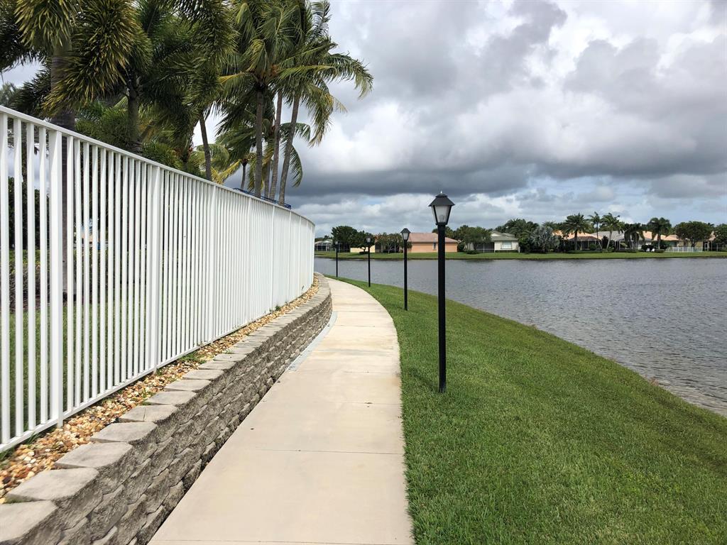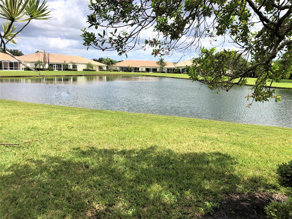 Enjoy spectacular lake views from a large, screened, covered rear patio (approx 150 SF) in this 2 bedroom, 2 bath villa that also includes a bonus 10' x 12' den/study room, and a garage. Other features of this desirable ''Spinnaker'' model are tasteful vaulted ceilings, a walk in closet, an open kitchen, and pavered driveway. A newer range & refrigerator, new microwave, a 2015 central air unit, updated flooring, and a screened entry porch / screen door are also included. Community amenities include a 24 hour manned gate, tennis courts, clubhouse, pools, fitness center and more.