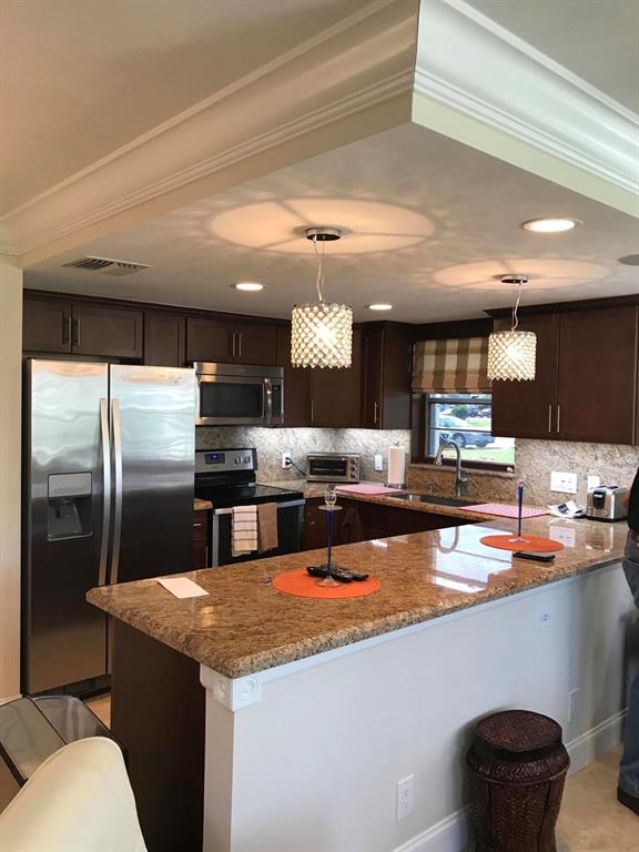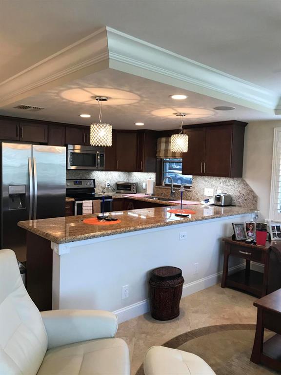 THIS CONDO HAS BEEN COMPLETELY RENOVATED BY A CONTRACTOR. EVERY THING WAS DONE WITH QUALITY WORK MAN SHIP. CONDO FEATURES 7 INCH CROWN MOLDING, RECESSED LIGHTING, VAULTED CEILINGS, GRANITE COUNTER TOPS, CABINETS OF HIGH QUALITY WITH TWO LAZY SUSAN FOR EXTRA STORAGE, WITH OTHERS BUILT INS FOR MORE STORAGE THRU OUT THE CONDO. CERAMIC TILE THRU OUT, CHEF'S KITCHEN WITH PLENTY OF COUNTER SPACE FOR ENTERTAINING, SURREAL SOUND IN LIVING ROOM AND DIFFERENT SET UP SOUND IN BEDROOM. POCKET DOORS, PLANTATION SHUTTERS, HURRICANE IMPACT WINDOWS ON PATIO ENCLOSED WHICH LEADS TO SIDEWALK TO PARKING. TANK LESS WATER HEATER, FULLY FURNISHED AND STOCK WITH DISHES, LINEN, ETC. CLOSE TO POOLS, TURN KEY MODEL, OWNER HAS GREAT TASTE IN FURNISHINGS AND WILL LEAVE EVERY THING EXCEPT A COUPLE OF PAINTINGS.