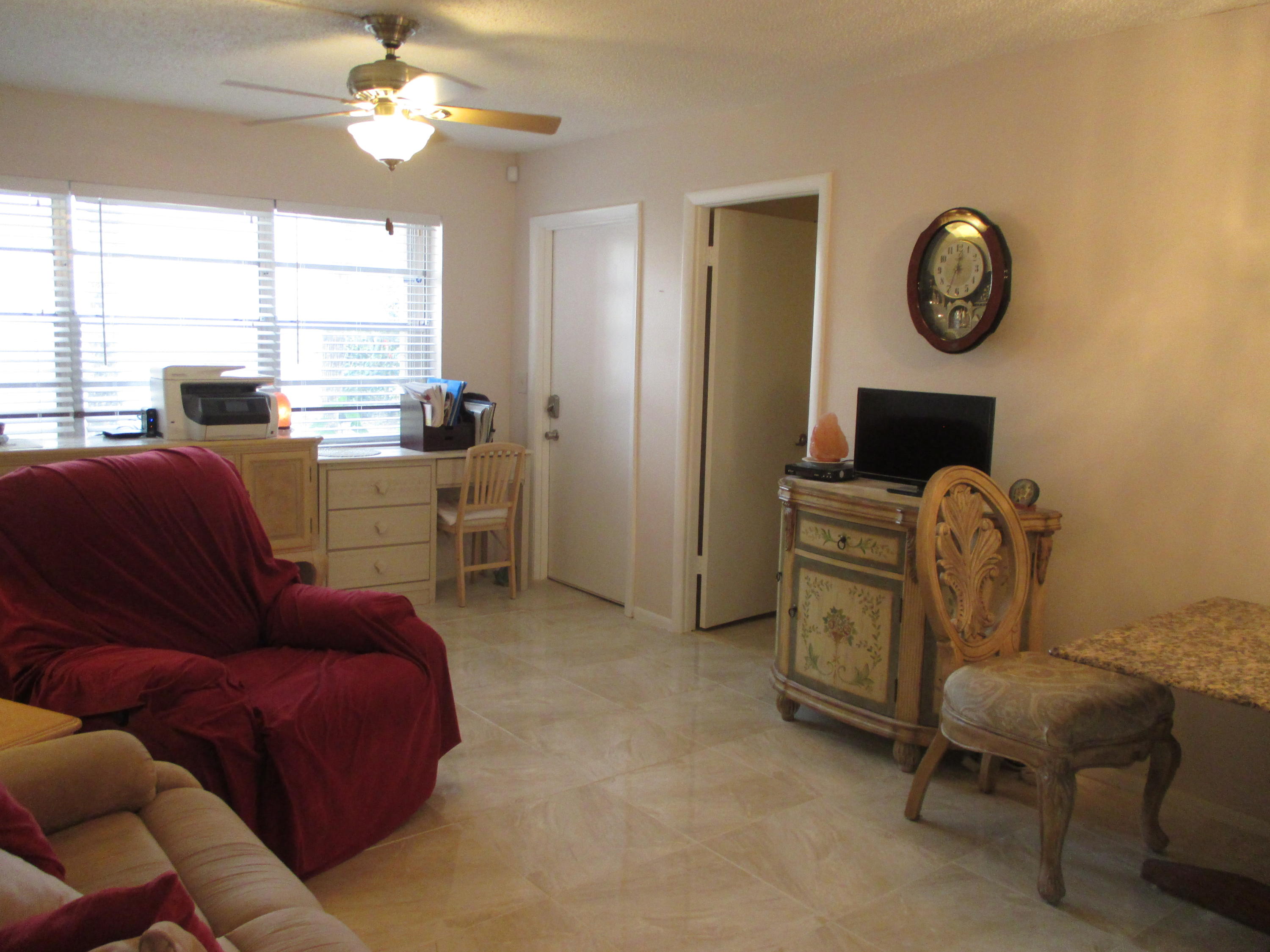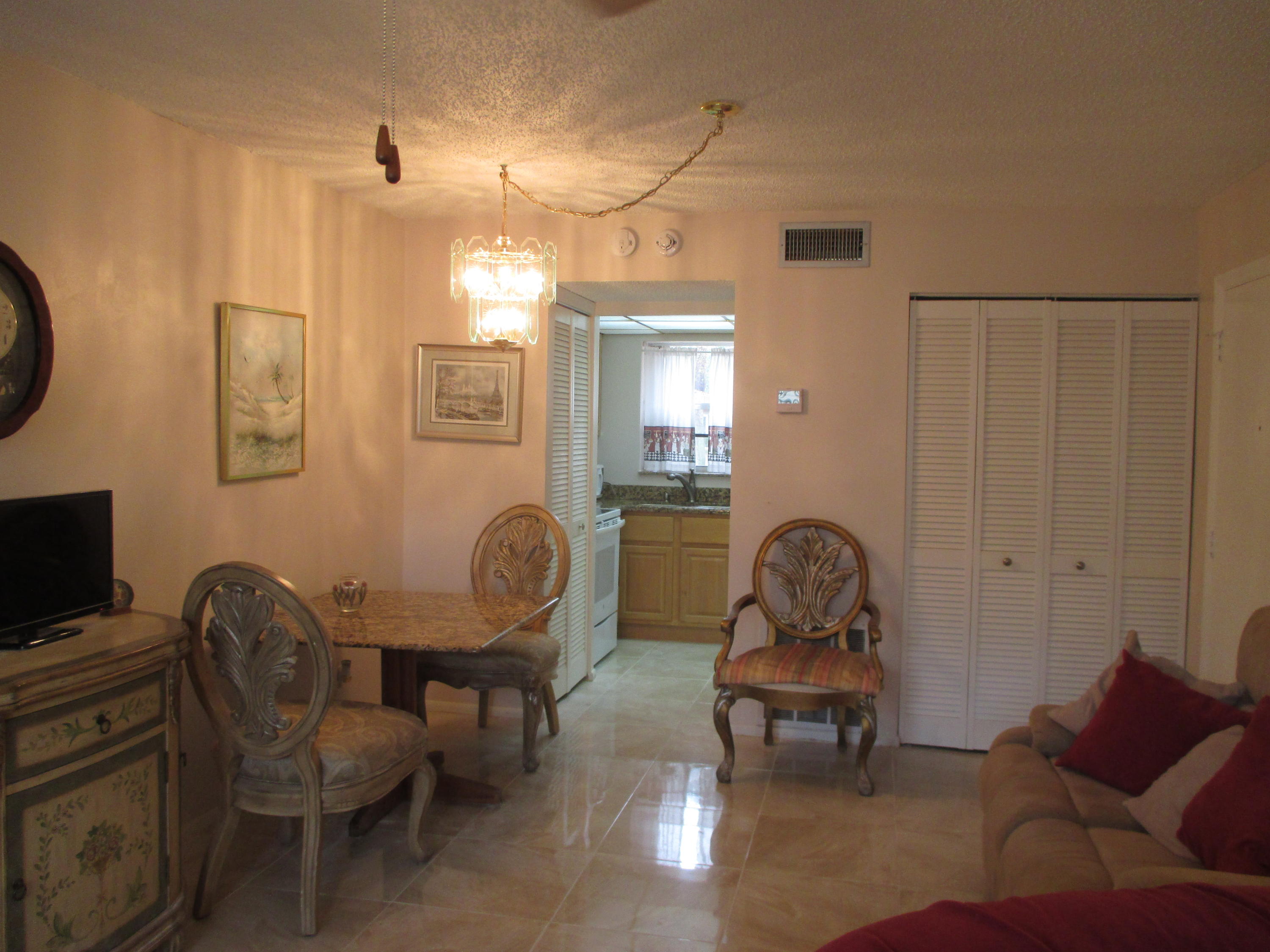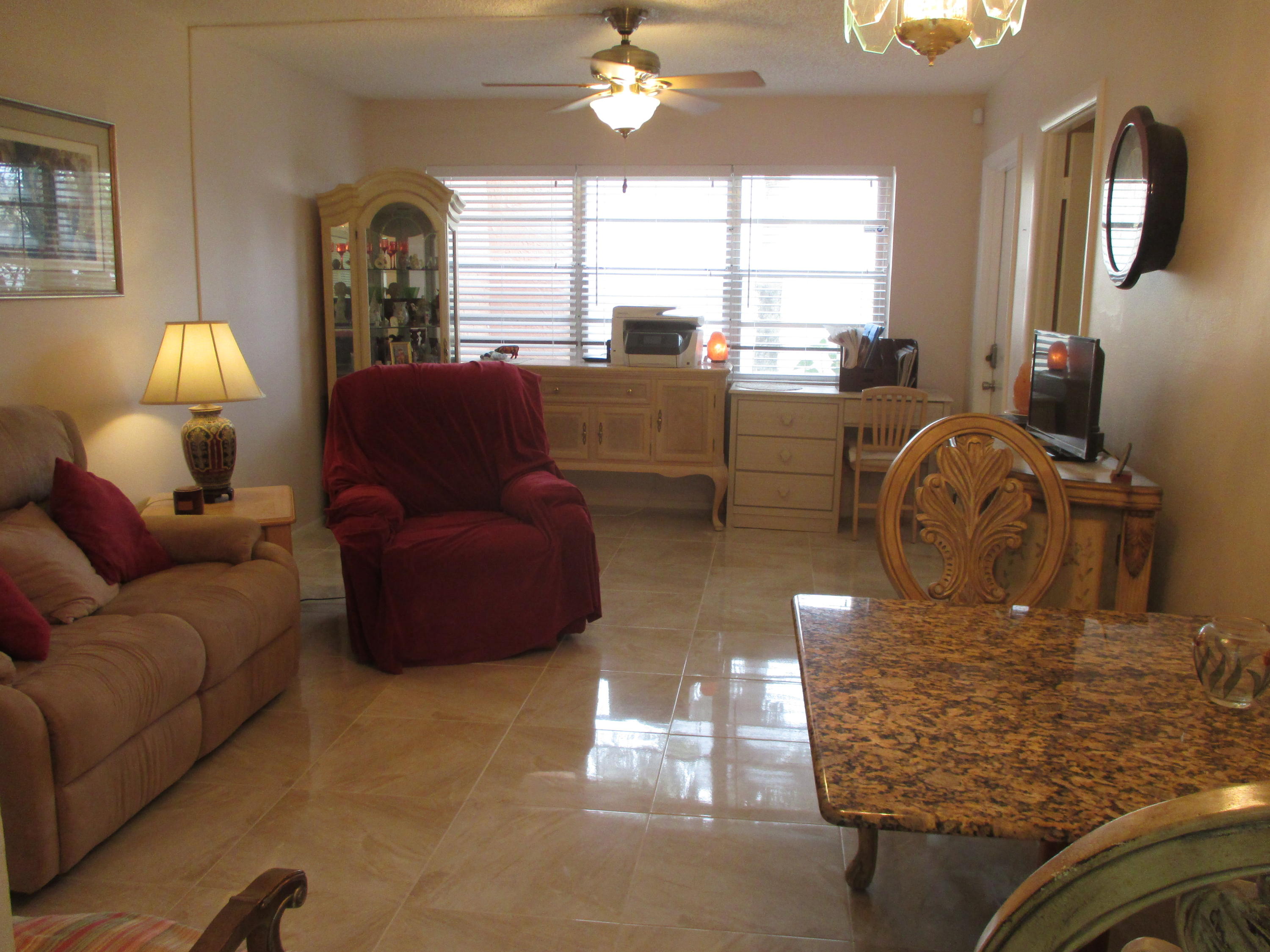 Amazing remodeled first floor 1/1. A must see, too many upgrades to list all.New kitchen w/granite counters, new cabinets w/soft close drawers, a/c 2015, new refrigerator & Borch dishwasher, full size W/D. 18'' porcelain marble design tile throughout unit. Remodeled bath with tiled walls, new shelving, new bi-fold doors, ADT security system, security film on all windows and accordion shutters. 11x5 enclosed patio. Granite dining table to stay and some other furniture if buyer wants. Active 55+ guard gated community with courtesy bus two days a wk to grocery, malls, stores etc.