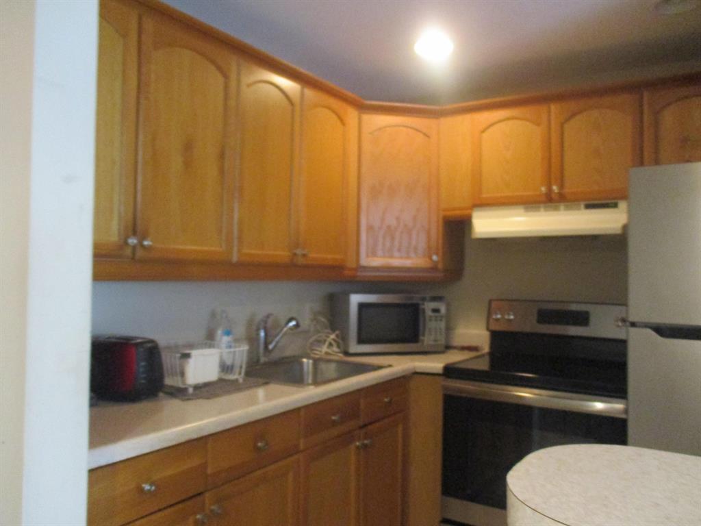 kitchen open concept new cabinets and appliances. Tiled shower near laundry in building.