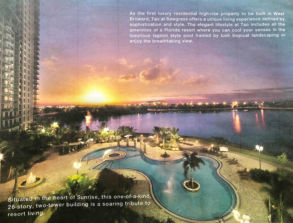 SPECTACULAR 360 VIEW TO THE CITY, AND LAGOON, ON THIS CORNER UNIT. THE THIS FABULOUS LUXURY TAO TOWER, IN PLANTATION BY SAWGRASS MILLS MALL, .3 BEDS, 3 BATHS 2 CAR GARAGE,. ENJOY THE RELAXING EVENING AT THE TWO TERRACES, WITH OPEN KITCHEN WITH GRANITE COUNTER TOPS, AND STAINLESS-STEEL APPLIANCES. BEST DINNING AND SHOPPING' FITNESS CENTER, JACUZZI, BILLARD ROOM, TENNIS COURTS, BBQ GRILLS WITH PICNIC TABLES, WITH SECURED LOBBY WITH 24HRS CONCIERGE AND CAMERAS.