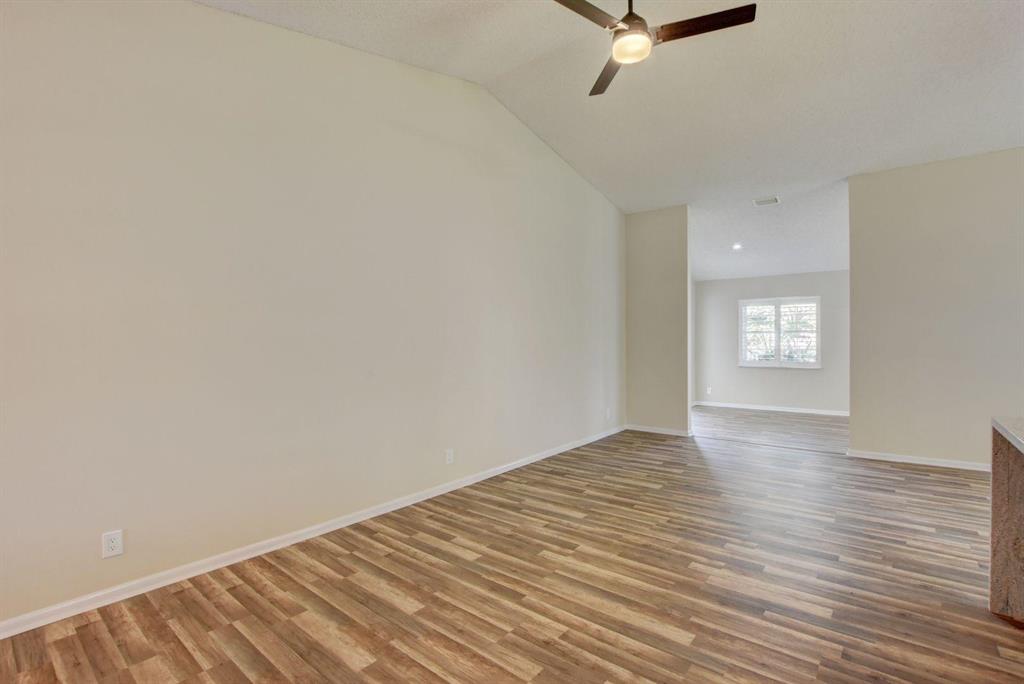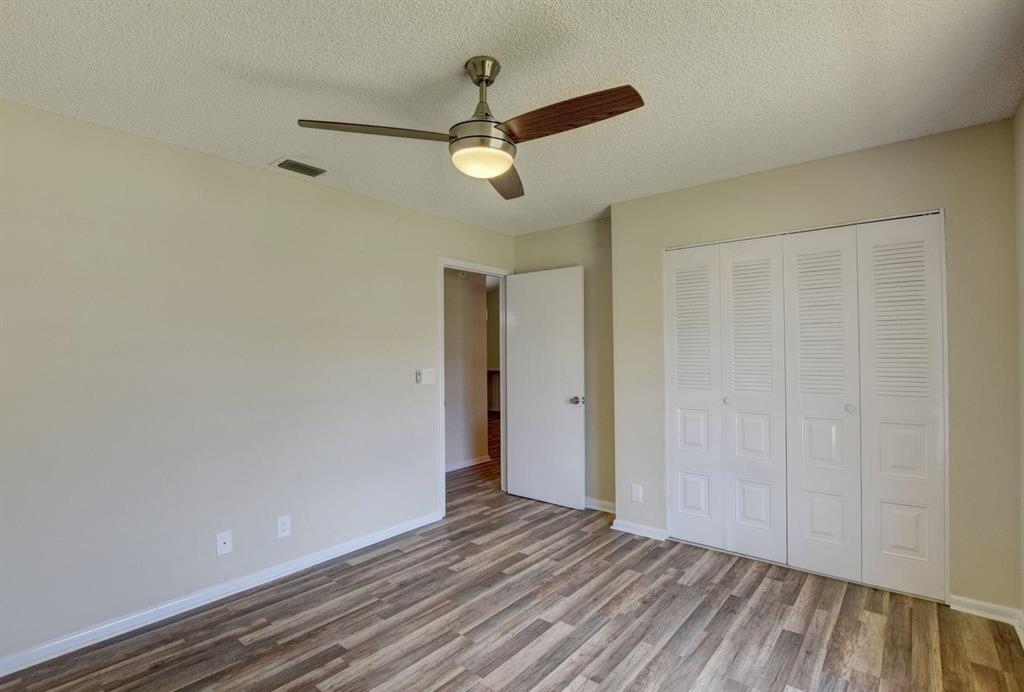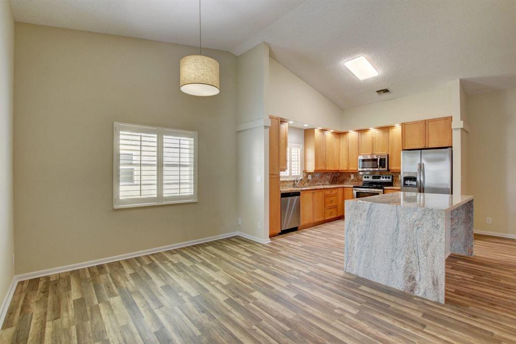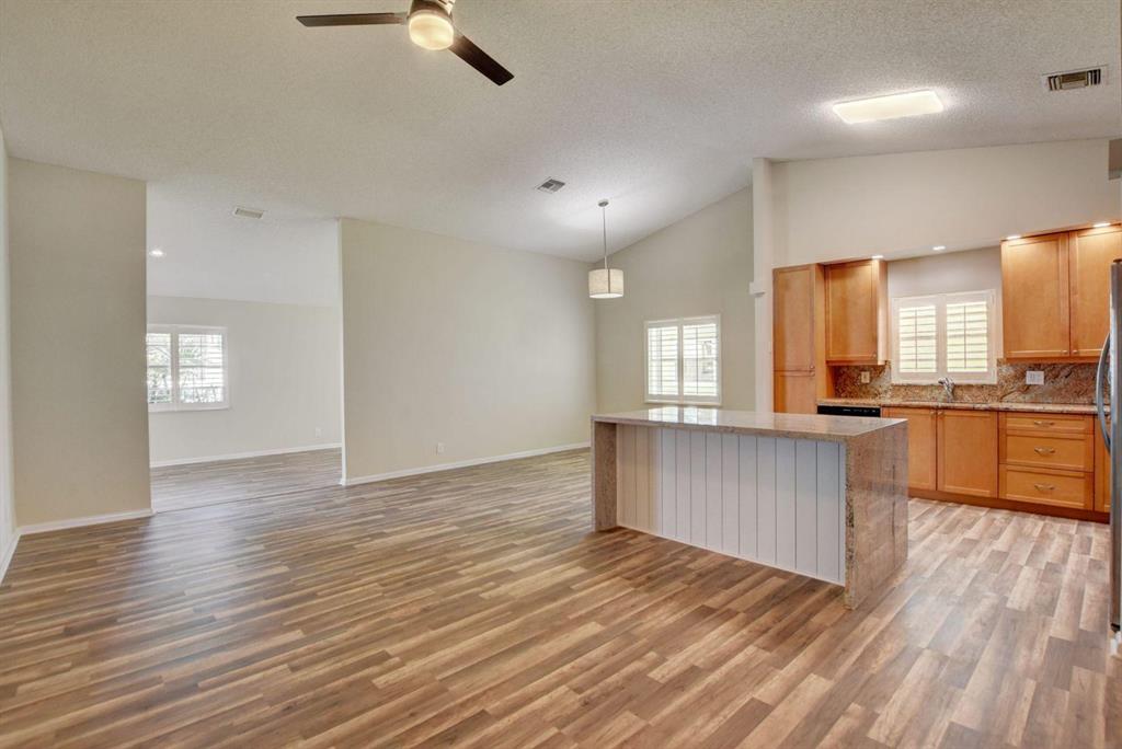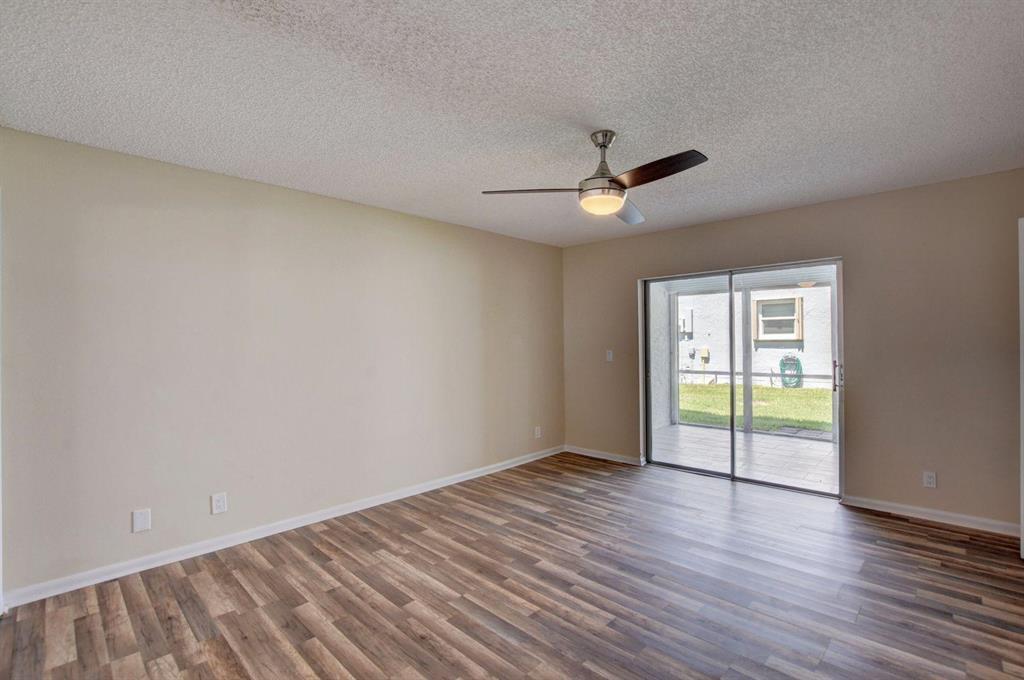 Beautifully renovated villa with oversized 1 car garage in golf gated community! Bright open floor plan with re-designed kitchen center island with waterfall granite countertop, new stainless steel appliances, new fixtures and lighting. Stunning new wood-like floors in every room! Spacious bedrooms - master has 2 closets and both bathrooms have new vanities, fixtures and lighting. Huge screened patio with new tile floors. Plantation shutters in most rooms &and accordion hurricane shutters throughout! . Freshly painted interior (including garage) with lovely extra touches that make this an exceptional home! Must see! Tons of amenities in this well maintained gated community including large pool/hot tub, FREE golf, tennis courts, gym, game room & lots of events available.